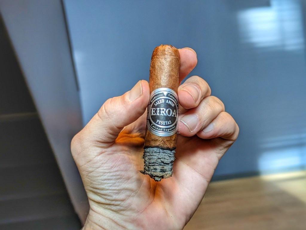 Apuntando a hacer la foto del segundo tercio para cuando estuviera más cerca de la mitad del cigarro, me distraje un poco y casi se me pasa. El segundo tercio es más dulce que el anterior, pero los sabores del paladar se reducen considerablemente y el Jamastran es mucho más interesante en el retrogusto. Hay notas tostadas en casi todos los sabores del paladar, que en este tercio solo incluyen notas de almendras y masa de pan, pero es más fuerte esa sensación fermentada. En el retrogusto me encuentro sal, cáscara de naranja, cáscara de limón y frambuesa. La intensidad es media, con una fortaleza similar, mientras que en términos de construcción se comporta idealmente.