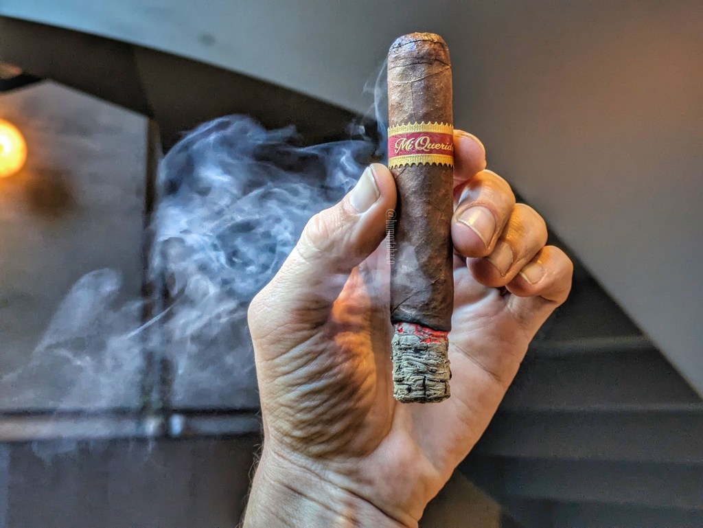 Tal como la gran mayoría de cigarros con capa Broadleaf, así como los que son hechos para Liga Privada, la cantidad de humo que emana de este Mi Querida Triqui Traca es impresionante. Sí debo destacar que esta imagen la hice justo después de una calada, y que el humo no es así de constante. Los sabores son de musgo, de madera tostada y de pimienta y otras especias, aunque a mediados del primer tercio también incluye tierra mojada y chocolate, que se funde con la pimienta y da la impresión de ser chocolate picante. La fortaleza es ligeramente sobre media, con una intensidad similar, pero muy sabroso y quemando lento.