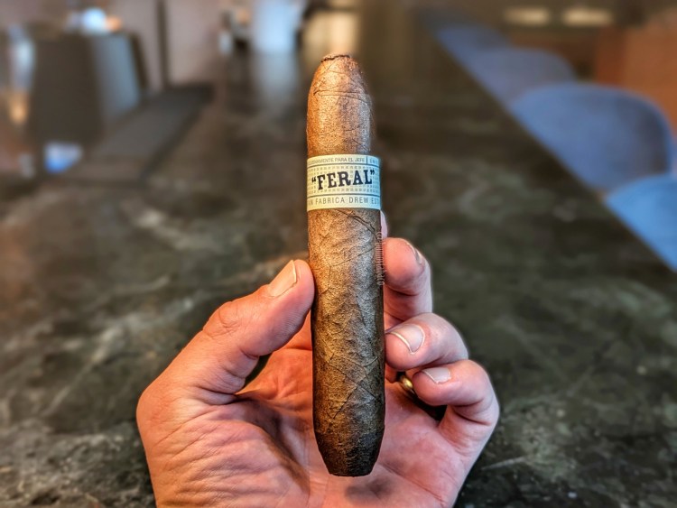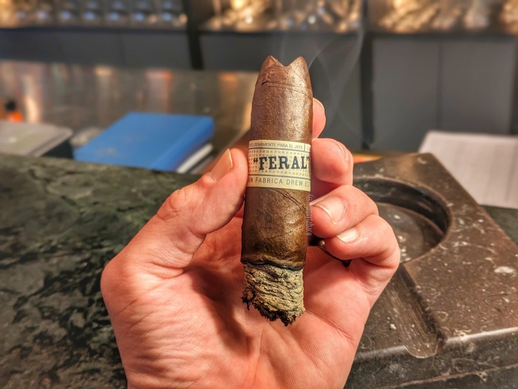 El primer tercio del Feral Flying Pig tiene esos sabores intensos y ligeramente ácidos de café espresso, combinados con chocolate negro, cedro y un retrogusto que incluye chocolate y cuero. Tiene una sensación picante en lengua, pero nada que sea abrumador y ésta aparece esporádicamente en el retrogusto. Como sucede con casi todos los productos de la línea Liga Privada, el Feral Flying Pig desprende una cantidad asombrosa de humo desde el pie pero también en cada calada. Este humo es denso y rico y pareciera no querer irse, por lo que el room note se siente achocolatado y delicioso también. Pero tanto la fortaleza como la intensidad son medios, cosa que no esperaba y que siento con mucho agrado.