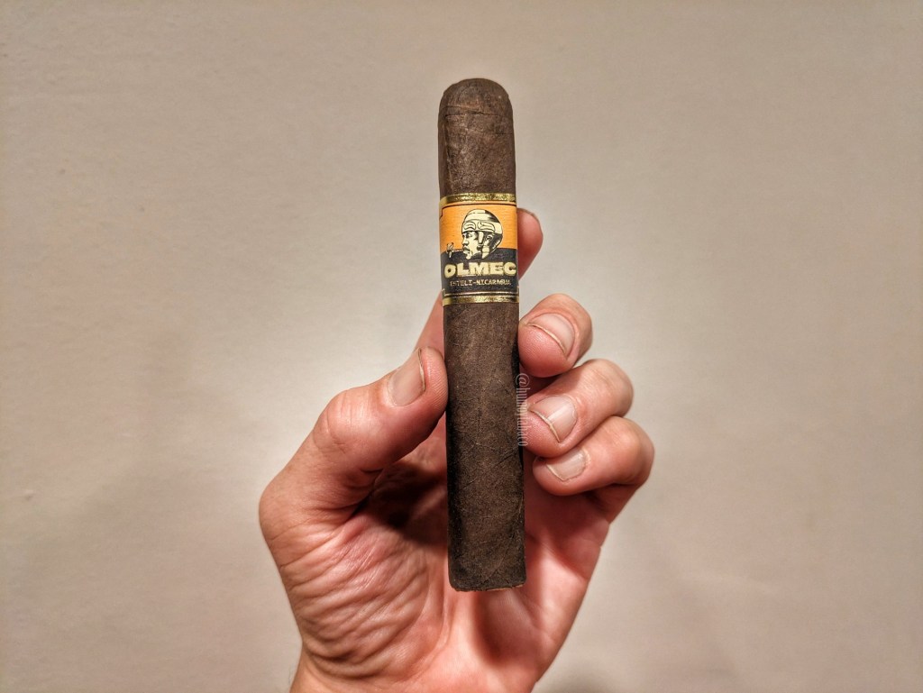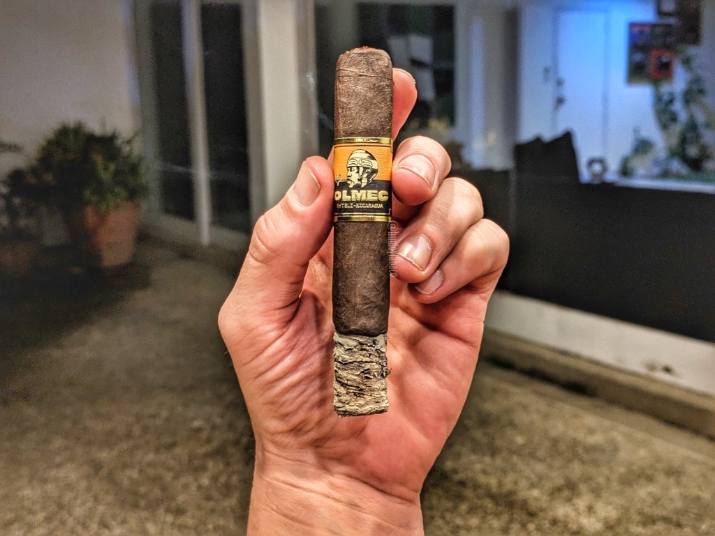 El Olmec Maduro tiene un ligero box press, incluso menos notable que en su versión claro. Pero esta capa también se siente más gruesa, como si tuviera más irregularidades y mayor número de venas, pero también es menos atractivo. Me explico, el Claro tenía una apariencia ligeramente oscura y más lisa, mientras que el Maduro se siente más rústico. Los aromas de la capa me causan mucha curiosidad porque me recuerdan a un refresco de cola, que si bien puedo deconstruir e identificar caramelo, regaliz negra y vainilla. La calada en frío presenta notas similares, pero incluye también pimienta y algo que me recuerda al bourbon, que puede ser maíz tostado, pero creo que eso es irme muy por la tangente. Es interesante sin duda y la sensación picante en los labios me hace querer encender el cigarro lo antes posible.
