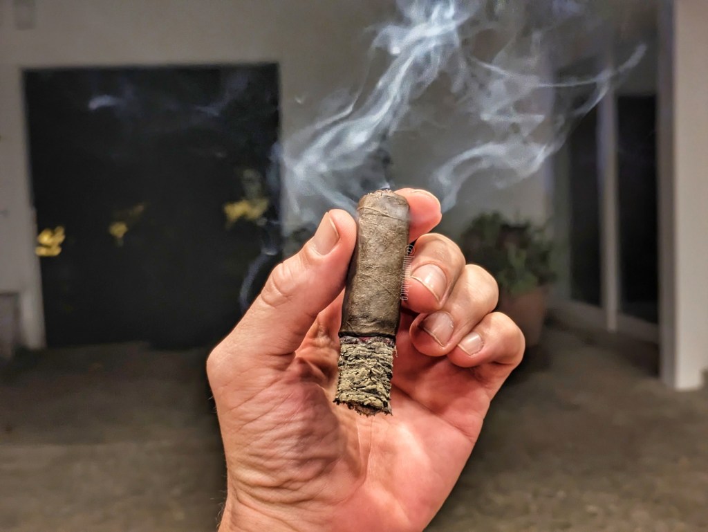 Siento como si el segundo tercio se fuma muy rápido, como si hubiese una parte del enrolado que no estaba completa, pues me toma aproximadamente 20 minutos fumar el primer tercio, pero para cuando me di cuenta que estaba acabando el segundo tercio y pude tomar la foto, apenas si había pasado media hora desde que encendí el cigarro. Los sabores tienen su transición y en boca se sienten notas más relacionadas a sabores tostados, incluyendo pan tostado, cotufas acarameladas, café tostado, malta y tierra seca. En el retrogusto las notas son muy similares, incluyendo esos diversos matices de harina horneada. La fortaleza aumenta ligeramente, aunque todavía en el rango de media, mientras que la intensidad se mantiene igual. La quemada y la ceniza relativamente larga en el primer tercio fue muy buena, pero una vez caída, parece imposible lograr que se mantenga mucho tiempo, y el anillo de combustión es variable, aunque no preocupa en lo absoluto.