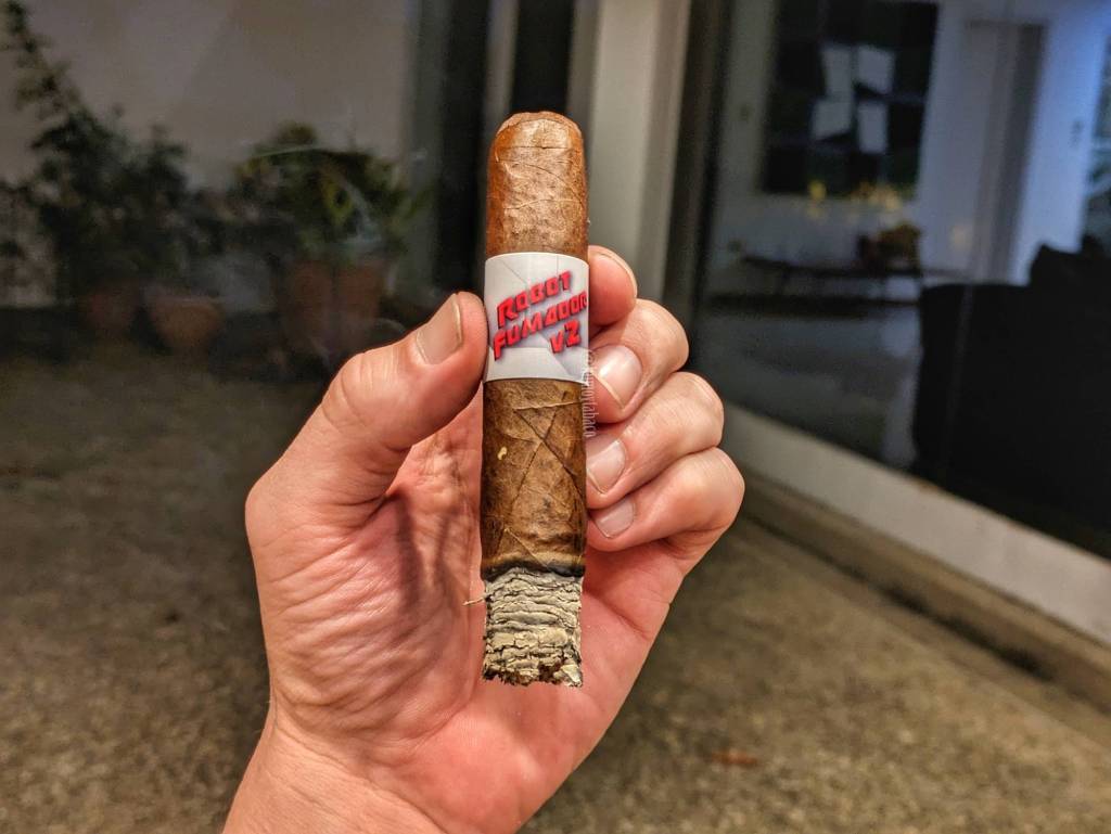 Me toma dos horas llegar al último tercio del Mr. Robot Fumador V2, pero han sido dos horas que he disfrutado un montón. En este tercio me encuentro con menos pimienta que en tercios anteriores, pero no mucha menos, avellanas, café espresso (al punto que casi se siente en boca la espuma del café), canela y la misma nuez moscada del primer tercio, que parece haber regresado. El retrogusto es suave de pimienta pero con ese componente que combina café con vainilla que identifiqué como algo salido de Starbucks. Sigue quemando muy bien y el anillo de combustión es bastante recto, con ceniza blanca y sin calentarse. Lo fumo hasta que me quemo los dedos y al mismo tiempo siento que quisiera extenderlo más. Me toma 2 horas y 15 minutos acabar con él.