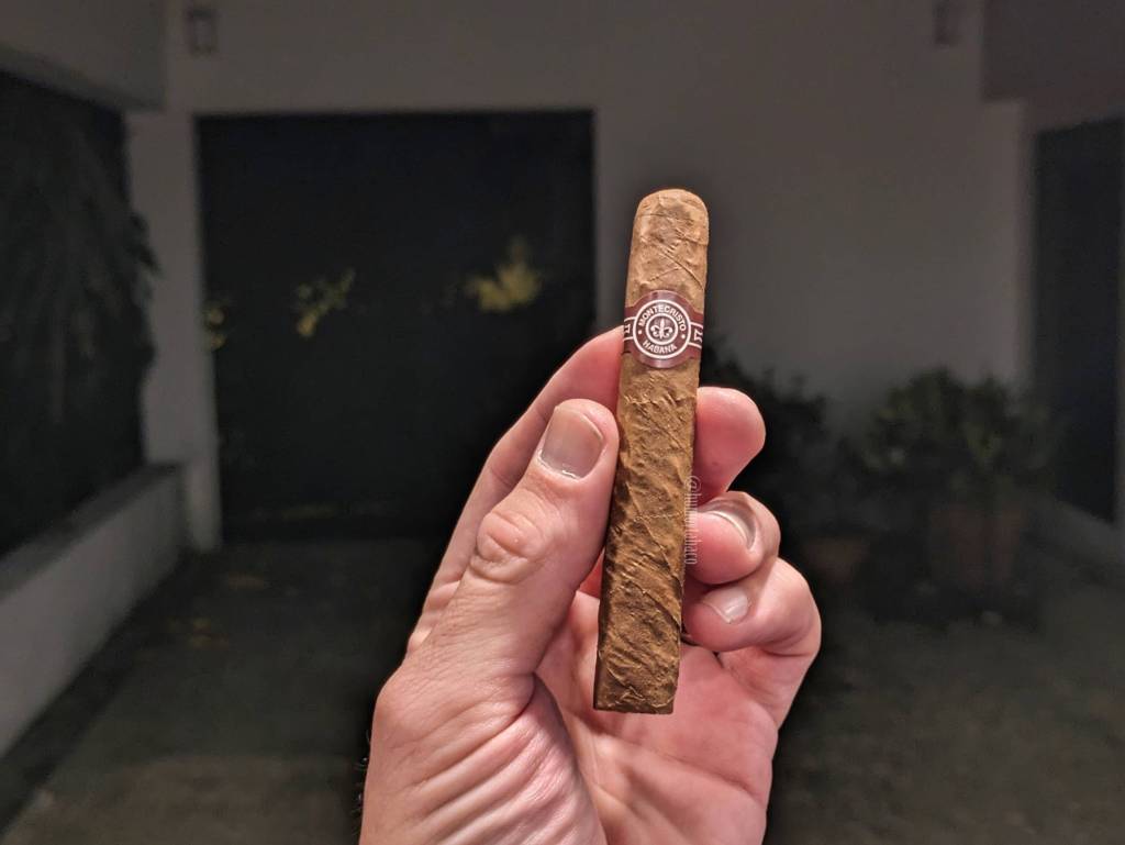 El Montecristo No. 5 es una de esas petit coronas tan típicas del mercado de habanos; una de esas fumadas cortas que tanto se mueven entre sus productos y los que valen la pena probar y comparar. Viendo como me fue con el Petit Churchills no hace mucho, esta es la propia vitola para continuar esa experiencia. Con medidas de 4 x 40, no hay mucho que exigirle en términos de tiempo, pero vamos a probar. En frío el aroma predominante es de tierra mojada y notas dulces como de marshmallow o incluso algo similar a cinnamon rolls, muy denso y envolvente. Estas notas se repiten tanto en capa como en calada, por lo que me dispongo casi de inmediato a probarlo. Pero debido a las dimensiones del cigarro, voy a dividirlo en dos mitades solamente.