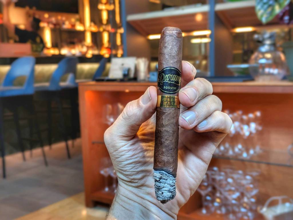 En el último tercio es el sabor de nueces el que toma la delantera, básicamente el de chocolate se mantiene en el mismo punto, pero las nueces se repotencian y regresa el sabor de canela con mayor intensidad que en el segundo tercio, pero sigue siendo algo secundario. La madera de cedro y el toque dulce también forman parte de este último tercio y más o menos para el momento que le quito la segunda anilla es cuando deja de mostrar nuevos sabores. Con una intensidad media-alta y una fortaleza media, y luego de una hora y 40 minutos, el Daruma finalmente llega a su última calada.