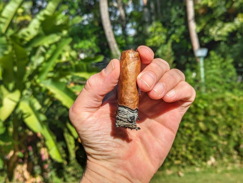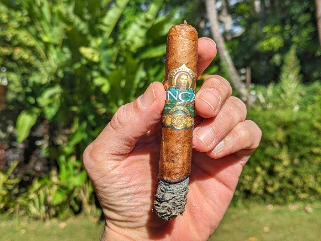 La fortaleza simplemente es demasiada en el último tercio, al punto que no lo fumo completo. Es una lástima, porque el Inca seguía produciendo sabores y muchos de ellos eran agradables y le habrían valido una puntuación muy decente, en donde los sabores de madera quemada (ya leña) son los dominantes y el de chocolate ya parece haber desaparecido, con notas suaves de nueces en el retrogusto, pero ya la fortaleza hace desagradable la experiencia y es luego de un rato de haber dejado el cigarro de lado que dejo de estar mareado, y ciertamente había almorzado bien. Me toma una hora y 20 minutos llegar hasta el punto donde dejo el cigarro de lado, en donde seguía quemando muy decente.