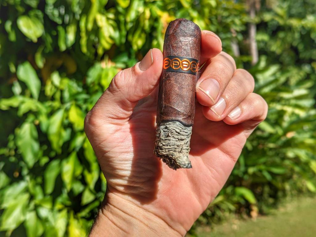 El Cosecha 149 comienza distinto a como esperaba, pues muchas veces un tiro apretado en frío suele soltarse un poco con el calor, especialmente uno de la calidad de Plasencia. Pero no. El tiro se mantiene apretado, con sabores a tierra seca, mucha pimienta y no mucho más, incluyendo en el retrogusto. A lo largo del tercio afortunadamente aparecen sabores a leña, masa de pan (sin dulce esta vez) y básicamente eso. Hay una sección del cigarro que no quema bien y es la que se nota en la imagen, pero por mucho que traté de retocarla y corregirla, volvía a aparecer. La intensidad es media, con una fortaleza media-baja.