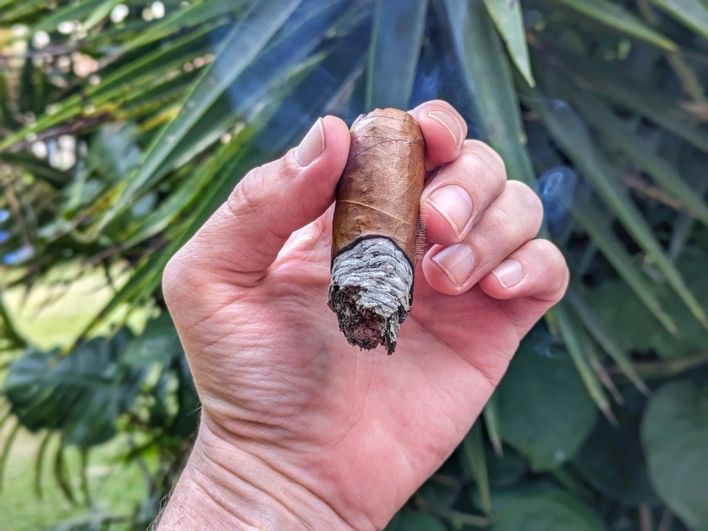 Los más observadores verán que piqué este cigarro con un corte en V y es que estos cepos tan grandes creo que funcionan mejor así, especialmente en cigarros con una cierta edad pues pocas cosas son peores que un cigarro de cepo grande y tiro apretado. El tiro en este Habano Corojo está muy bien, pero creo que es en gran parte gracias al corte. En el segundo tercio los sabores de chocolate pasan de un perfil más genérico a uno más como de mousse de chocolate, pero no es solo eso, sino que también hay pimienta, jengibre, canela, nueces y un toque de café, que hacen del Habano Corojo una fumada muy interesante e incluso compleja. Hacia el punto medio aparecen frutos secos genéricos y sin destacar ninguno, quizá nueces, y éstos lideran el cigarro durante el resto del tercio. Seguimos con una fortaleza baja, que cuando supero el punto medio se convierte en media-baja, con una intensidad que se mantiene en media. En términos de construcción, se comporta muy bien y hay muy poco que reclamar.