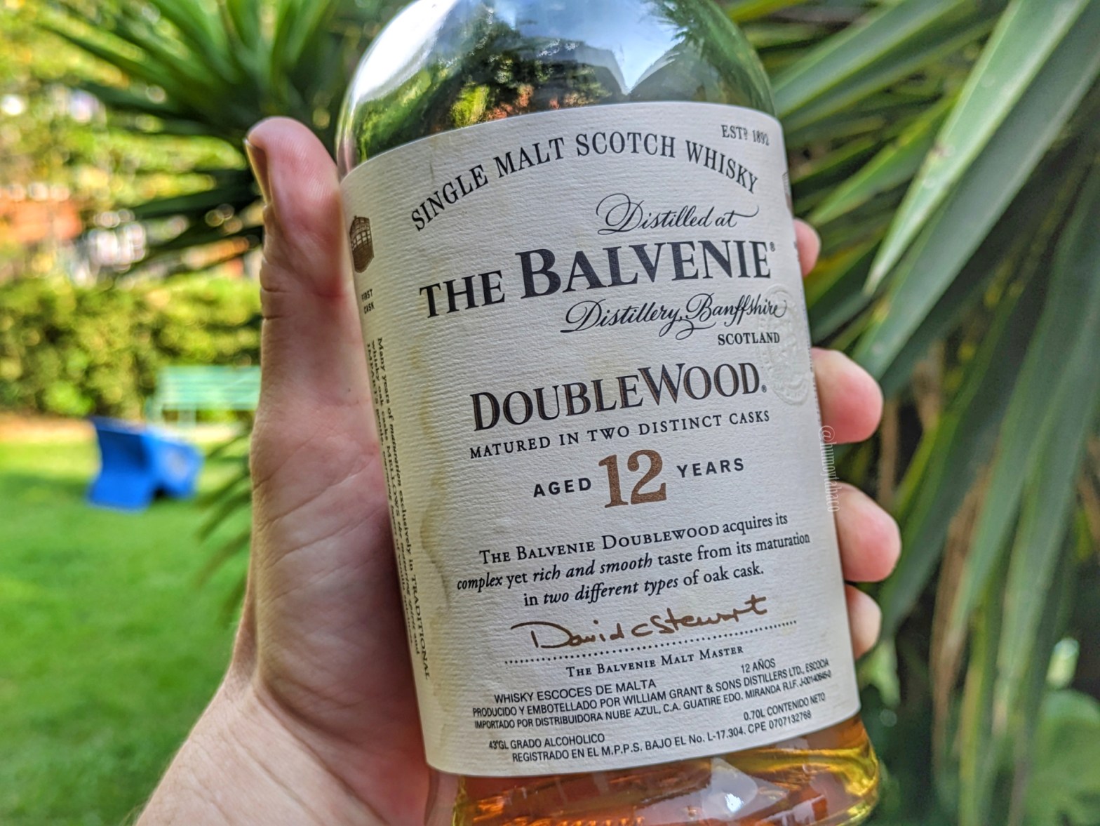 Esta versión del 12 años de The Balvenie se llama DoubleWood o doble madera, porque es añejado en barricas ex-bourbon de primero o segundo uso, y adicionalmente pasa un año en barricas ex-jerez oloroso. Es finalmente embotellado a 43% de alcohol.