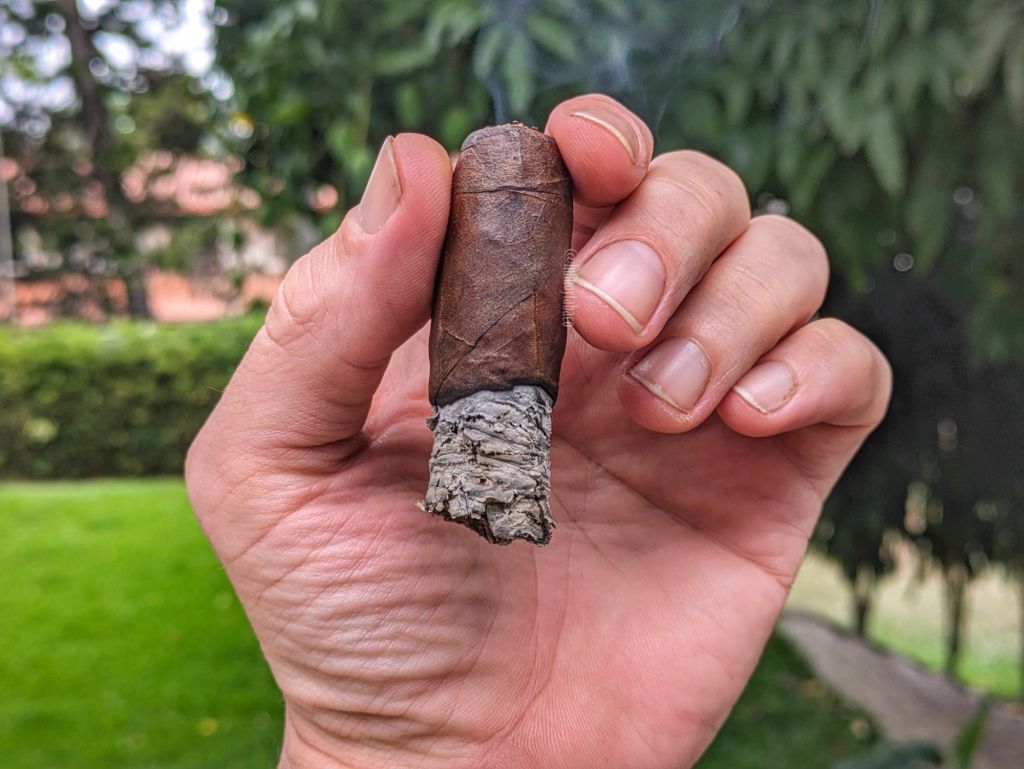 En el último tercio sin duda la intensidad ya se sitúa completamente en media, con sabores similares a los tercios anteriores, incluyendo madera, café y chocolate, pero con el añadido de nuez de Brasil y esa madera adquiere una propiedad como mojada y picante, lo que hace que su sabor sea mucho más «pegajoso» o incluso denso. Es más, el humo también adquiere una propiedad densa, al punto que casi tiene textura. La fortaleza se mantiene baja y así finaliza, una hora y 15 minutos después de encendido.