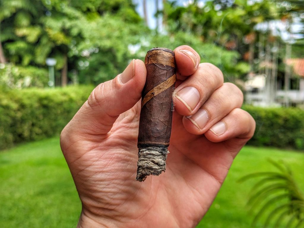 El último tercio es rico y abundante de sabores, sin muchos cambios en ellos. La intensidad sigue en alta y la fortaleza se coloca en media, la fumada se hace lenta pero principalmente porque estoy tratando de espaciar lo más posible cada calada porque no quiero que se acabe. El anillo de combustión perfecto y el humo abundante, y los sabores ideales en cada calada. Me toma una hora y 20 minutos fumar este SBC 22 y al final, la verdad es que quedaba fumada, pero decidí dejarlo hasta ahí para que no cambiara tanto, porque lo estaba haciendo.