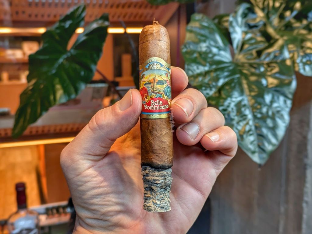 El Bella Dominicana comienza más fuerte de lo que esperaba, recordándome más un blend nicaragüense que uno dominicano. Las notas de pimienta son destacadas, pero es acompañado por almendras tostadas, paja, tierra y cuero. En el retrogusto hay pimienta, pero también una dulzura de maple que no puedo dejar de probar. La construcción está muy bien, con un anillo de combustión relativamente recto y una ceniza que se produce durante un buen tiempo. Para el final del primer tercio la intensidad está en media, con una fortaleza media-alta, que no es la relación perfecta pero espero que se vaya equilibrando en el segundo tercio.