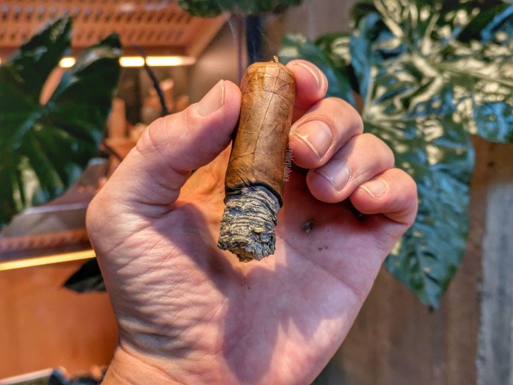 Las notas de chile picante del segundo tercio desaparecen en éste, pero se quedan las notas de almendras, aunque ya no tostadas, cedro, regaliz negra, granos de café y un toque cítrico. Ese dulce de maple del retrogusto se reduce un poco, pero no desaparece, aunque la pimienta del retrogusto es lo más resaltante en intensidad. Pero sigue quemando muy bien y mantiene la intensidad en media, aunque varía hacia media-baja y la fortaleza se queda en media. Luego de una hora y 15 minutos, este Bella Dominicana E llega a su fin.