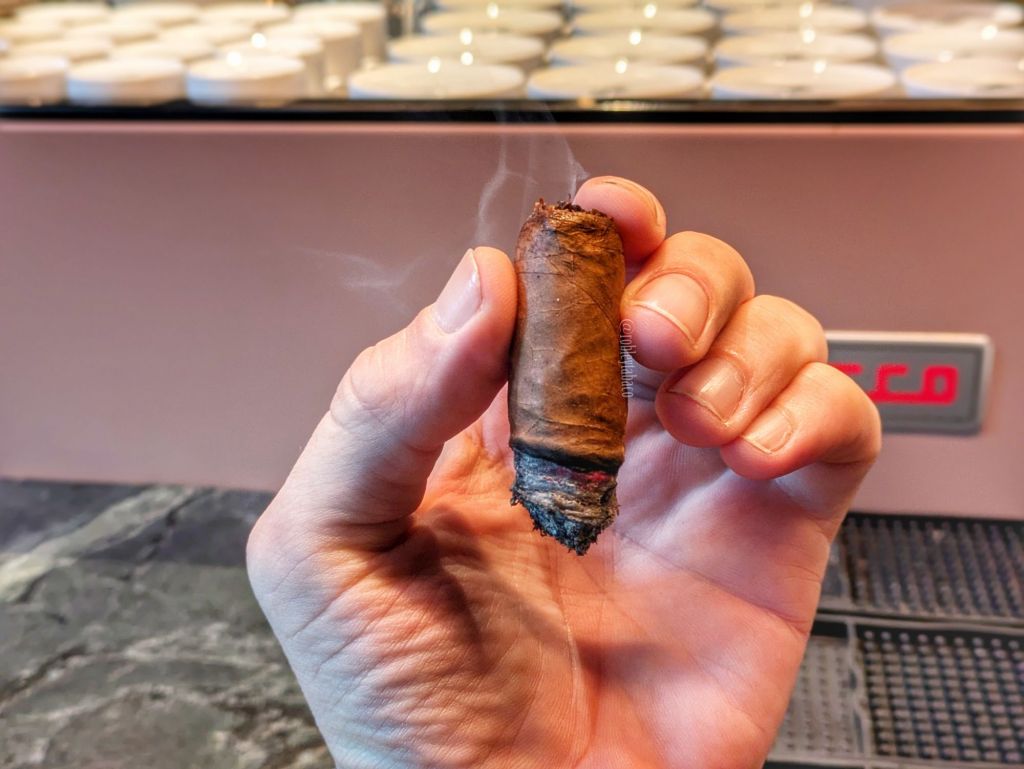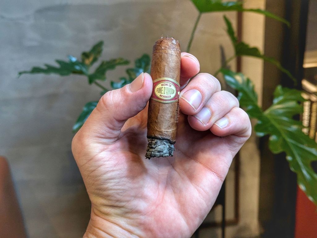 El galardón que haya recibido este cigarro puede haber sido muy importante en su momento y ciertamente lo empujó hacia una fama momentánea. Pero el tema cuando se siguen haciendo los cigarros es que se agarran mucho de eso de «declarado el mejor cigarro del mundo hace 10 años» y efectivamente, estando en el Top 25 en 2014 y probarlo en 2024, teniendo en cuenta que no es un cigarro con 10 años de añejamiento, sino un cigarro con una receta/blend que tiene 10 años de edad. No por eso me va a dejar de gustar o le voy a agarrar idea; he probado cigarros recientemente con ligas que fueron creadas a principios del siglo 21 y bien pueden gustarme o no. Nada en la fumada me hace pensar que carezca de ligero, porque bastante fuerte fue, y quizá sea la fortaleza constante y no el desarrollo de ella durante la fumada lo que lo identifique. Pero el Fume d’Amour es un cigarro que me gusta bastante y aunque me inclino más por los robustos, creo que este funcionaría mucho mejor en una vitola más grande.