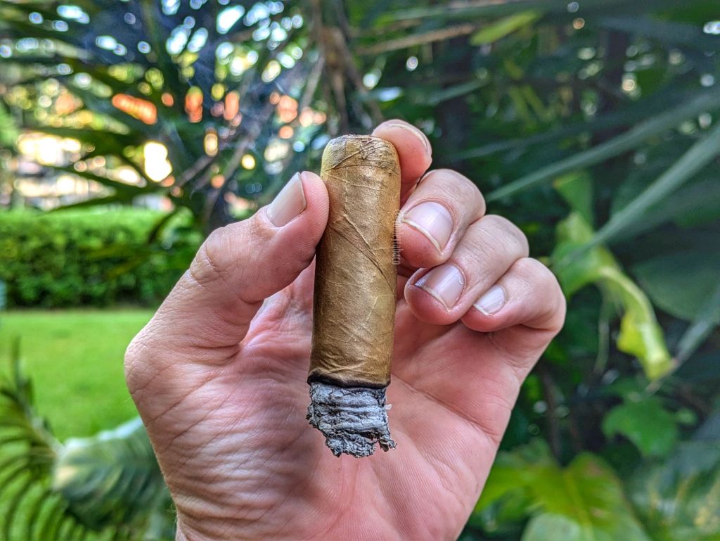 La mermelada en el paladar se siente más pegajosa y cremosa, pero menos frutal, como si se tratase más bien de un almíbar o jarabe simple, pero las notas de madera alcanzan el mismo nivel y son lo más destacado de este último tercio, aunque esa pimienta del retrogusto se vuelve más insistente en cada calada y aumenta la fortaleza a media-alta, junto con la intensidad que se encuentra en el mismo punto. El punto negativo es que esas notas cremosas parecen haber estado atadas a la nota frutal y al desaparecer una, se lleva a la otra. En el último tercio sí llega un momento que el cigarro se siente muy suave y se calienta cada vez más, por lo que lo dejo morir con dignidad cuando en teoría le podría haber quedad un poco más de fumada, pero corría el riesgo que simplemente se apagara, aunque el tiro iba muy bien. Me tomó una hora y 35 minutos fumarlo completo.