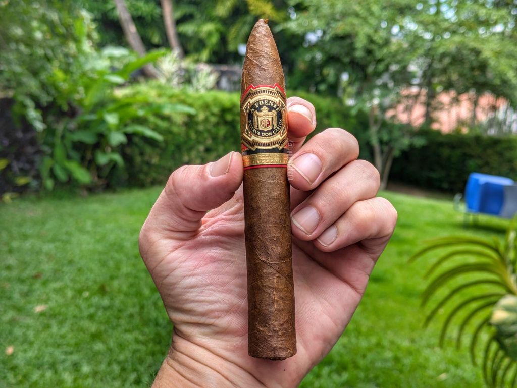 Exceptuando la línea de Opus X, Don Carlos ha sido el top of the line de Arturo Fuente y este es probablemente el tercero o cuarto que reseño, siendo todos los anteriores experiencias muy positivas. Existen dos versiones del Don Carlos, uno en capa «natural» que viene siendo Cameroon y el otro en capa madura, que no estoy claro ahora mismo de cuál es. Para diferenciarlos, uno se llama el Don Carlos y el otro es el Don Carlos Maduro. Este torpedo, que en verdad es más como una pirámide, mide 6 x 55 y su capa tiene muy pocos aromas, apenas destacando notas de madera seca, mientras que en el pie tiene notas muy suaves de chocolate y aserrín. Lo pico con la guillotina en V y la calada en frío me da notas de madera, cuero y toques herbales.