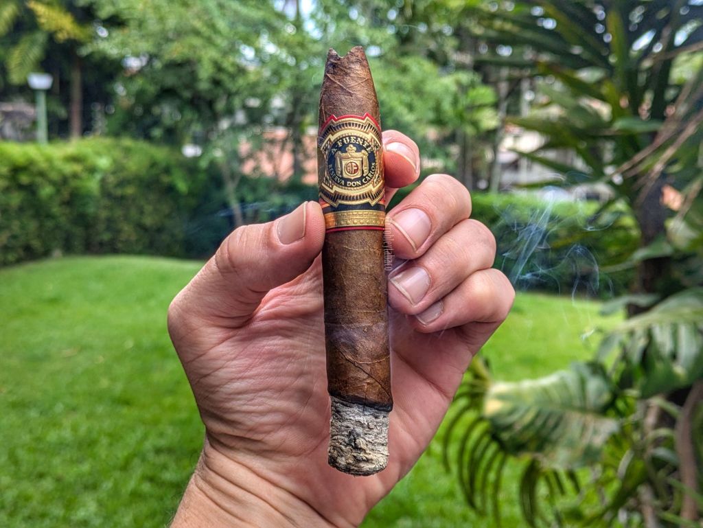 La sensación de encender un tabaco vintage y sentir todos esos sabores que han esperado tanto tiempo para pasar por las hojas y ese calor que el cigarro ha añorado no se sienten cuando enciendo este Don Carlos. En efecto, hay humo, hay notas suaves, pero la mayoría son muy suaves, apenas si descubro madera y un toque de tierra seca hacia el punto en el que hice la imagen. La quemada es buena pero el tiro no mucho, siendo algo apretado durante gran parte del tercio. No es un tema de cortarlo más, pues la guillotina en V garantiza un corte profundo y en la imagen es bastante obvio hasta donde llegó. La fortaleza es baja, con una intensidad en ese mismo orden.