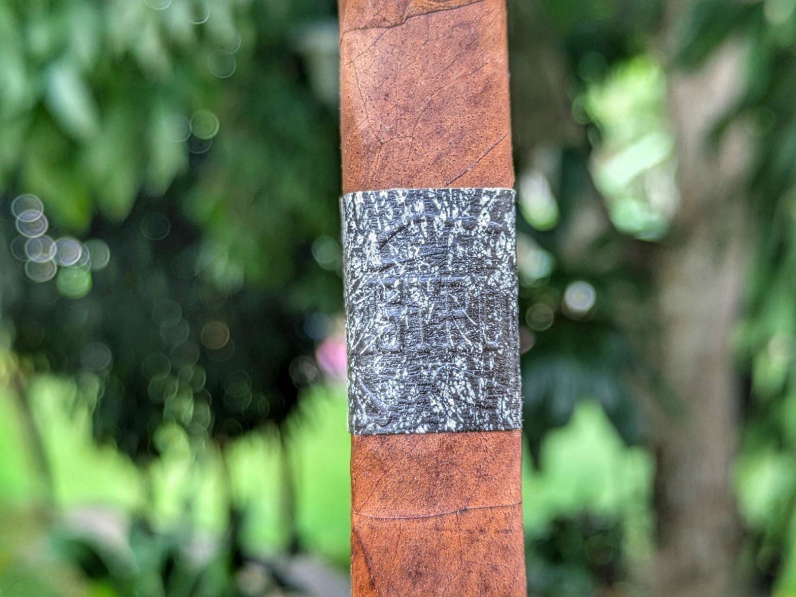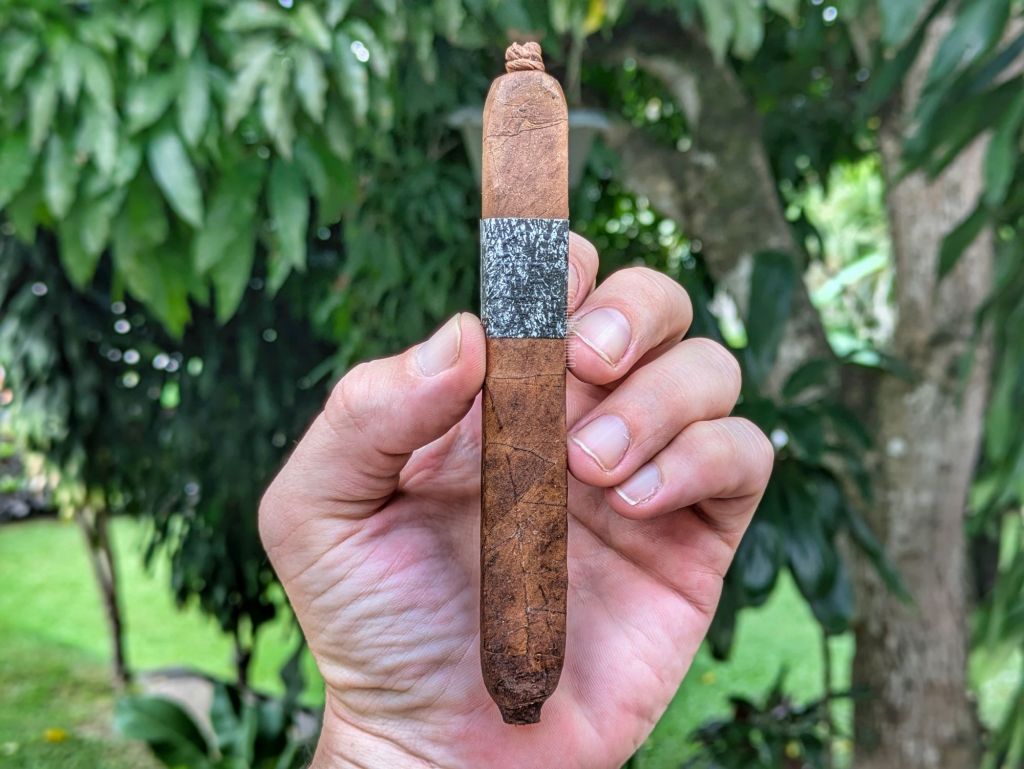 La anilla de este cigarro siempre me ha llamado la atención, principalmente porque a simple vista pareciera no decir nada, pero a contraluz se lee La Instructora por relieve. La variedad de colores en esta capa brasileña es grande, pero también pareciera que es más oscura hacia el pie y más clara en la perilla. Tiene aromas interesantes que incluyen chocolate, notas florales y cereza sintética, mientras que en el pie ni siquiera voy a intentarlo. Pero la calada en frío, con un tiro algo apretado, sin duda por la forma del cigarro, tiene notas de café, pimienta y tierra seca.