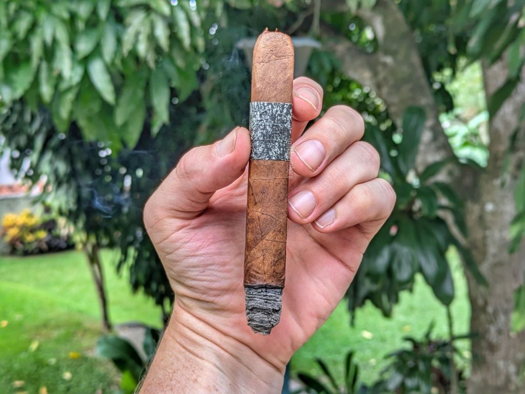 Aunque tiene un cepo de 47, que no es algo notablemente grande y con el box pressed se siente más pequeño aún, el BP quema bastante lento. Luego de superar la parte más angosta del cigarro, el tiro mejora pero no mucho pero los sabores no se hacen esperar e incluyen notas de tierra y madera como principales, desarrollando sabores secundarios muy variados, que incluyen frutos rojos, café y leña. Hay notas ligeramente dulces, con notas incluso cárnicas en el retrogusto, con una buena dosis de pimienta, aunque no sea abrumadora. Quema muy bien y, como dije, muy lento; me toma casi 25 minutos acabar con el primer tercio, con una intensidad media-alta y una fortaleza media. La ceniza la dejo caer finalizando el tercio, pues con este cepo no me puedo poner a inventar mucho.