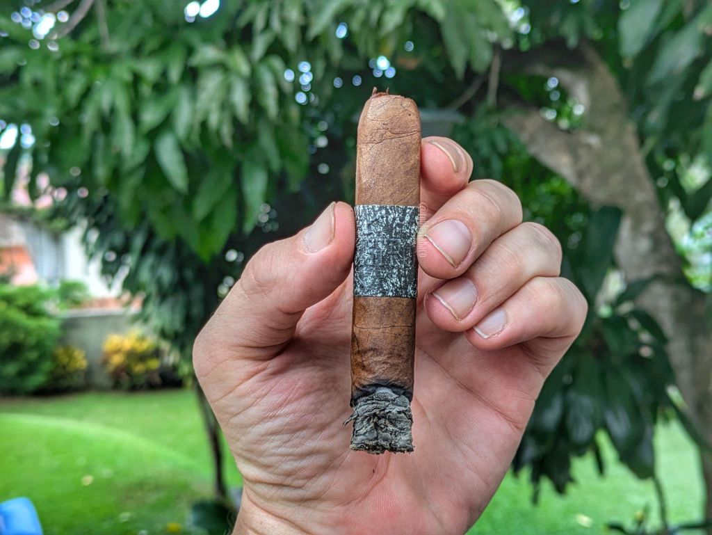 Pero sí debo destacar que pese a que no ha quemado uniforme, en ningún momento ha requerido retoques, ni siquiera si lo dejé en el cenicero más de un minuto para avivar la candela. El sabor de tierra se destaca entre los principales en este último tercio y los sabores dulces del BP me dan matices de vainilla, café y regaliz roja, como de esa cereza sintética que sentí antes. El humo se hace menos abundante en este tercio, como preparándose para la despedida, pero el cigarro nunca desvive y con una intensidad media y una fortaleza media-baja, al cabo de una hora y 40 minutos, finalmente dejo el BP en el cenicero.