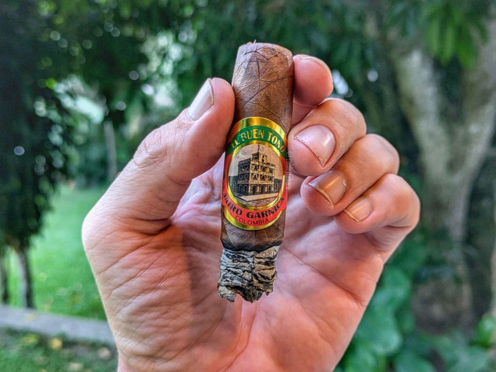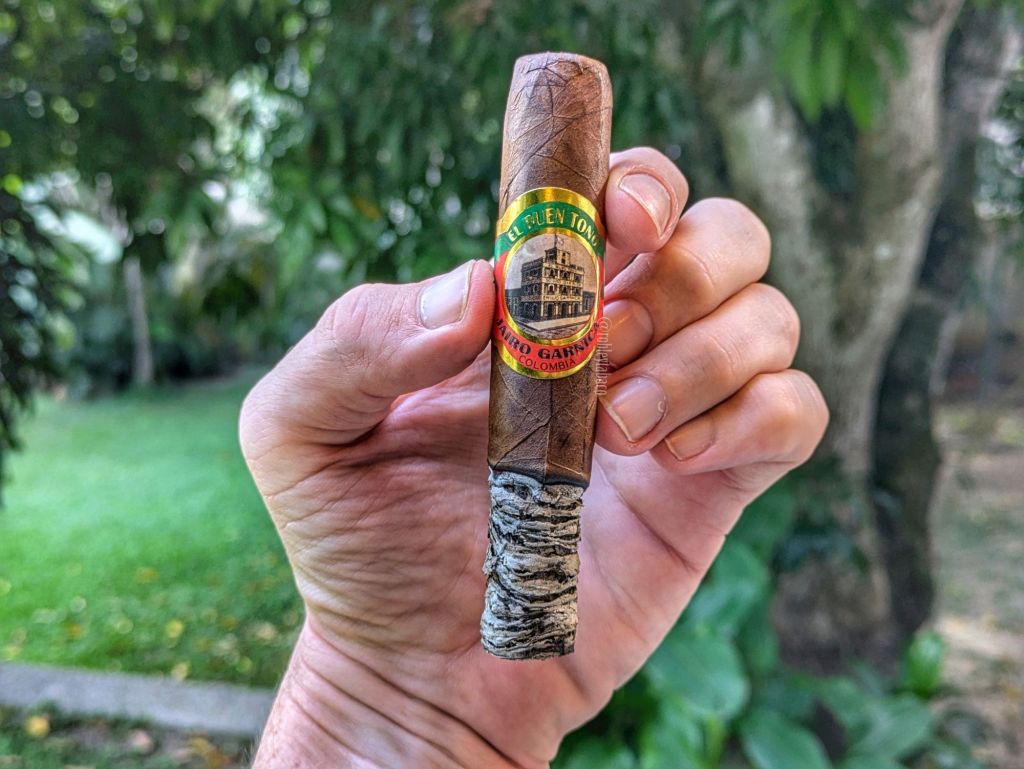 El primer tercio de El Buen Tono es mucho más interesante y sabroso de lo que esperaba, aunque en verdad no puedo decir qué es lo que esperaba, pues todas las fumadas de tabacos colombianos han sido una caja de sorpresas. Aquí me encuentro con sabores picantes muy sutiles, seguidos de notas más fuertes de madera, café espresso y almendras. A lo largo del tercio se siente relativamente dulzón y el retrogusto de mantequilla y vainilla solamente contribuye a darle mayor profundidad a esos sabores. La fortaleza es media-baja, con una intensidad media-alta, un anillo de combustión muy decente pero la sensación por momentos de que se apagó. Tiene un tema en el tiro que siento que jalo y pasa aire, pero no sale humo. Sigo fumándolo a ver si se resuelve.