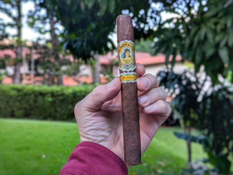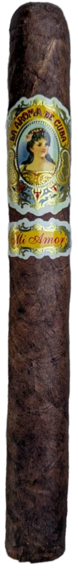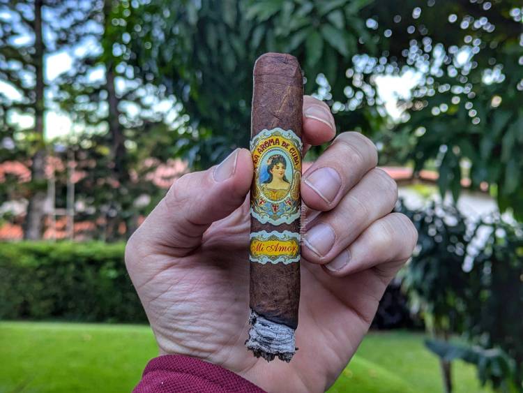 La Aroma de Cuba es una de esas marcas que le pone nombres ‘creativos’ a las vitolas de sus productos, incluyendo Inmensa, Valentino, Magnífico, entre otras. Pero este Churchill simplemente se llama así. Otro tema llamativo es que posiblemente veas otras anillas de este cigarro en internet y es que hace un par de años las cambiaron y en las actuales predomina el uso del color azul. Este Mi Amor pareciera que originalmente tenía un cierto press, que no es necesariamente box press, sino algo que hace que el cigarro sea ovalado y eso está muy bien para darle caladas, pero es un poco incómodo para picarlo. La capa tiene aromas a cedro, notas dulces y cerezas, mientras que la calada en frío tiene abundante chocolate y notas más suaves de nueces y pimienta. En el pie ese aroma frutal de cerezas es lo más destacado.