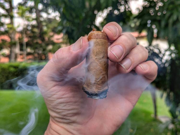 Me pasa que fuma tan rápido que la imagen del segundo tercio la hago cuando ya estoy casi bordeando el último. Hay una mayor fortaleza, llegando a media-baja, con una intensidad que alcanza la media y sabores similares al tercio anterior, pero la inclusión de pimienta también, así como notas suaves de nuez moscada y maní. Estos dos sabores son más sutiles de lo que esperaría, pero ya para el punto medio comienzan a intensificarse un poco. Aunque en la imagen no se note, la quemada sigue siendo buena pero la ceniza no se sostiene mucho sobre el cigarro. No obstante, no encuentro problemas de construcción.