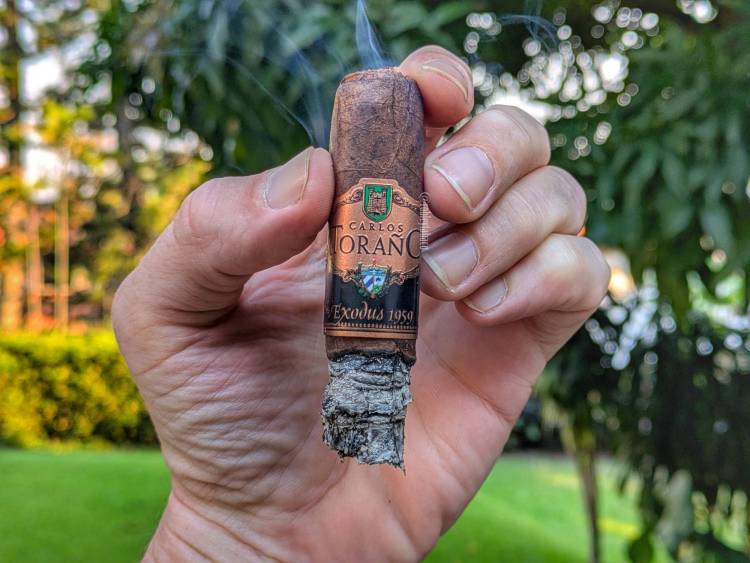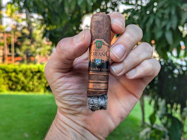 La capa madurada de este Exodus 1959 (50 Years) es considerablemente oscura, con múltiples venas grandes y algunas pequeñas también, pero un color relativamente uniforme y lo que pareciera incluso ser una sola hoja de capa. Esta capa Arapiraca brasileña tiene aromas a chocolate y pimienta, mientras que en la calada en frío me encuentro con chocolate, café y un toque de cuero.