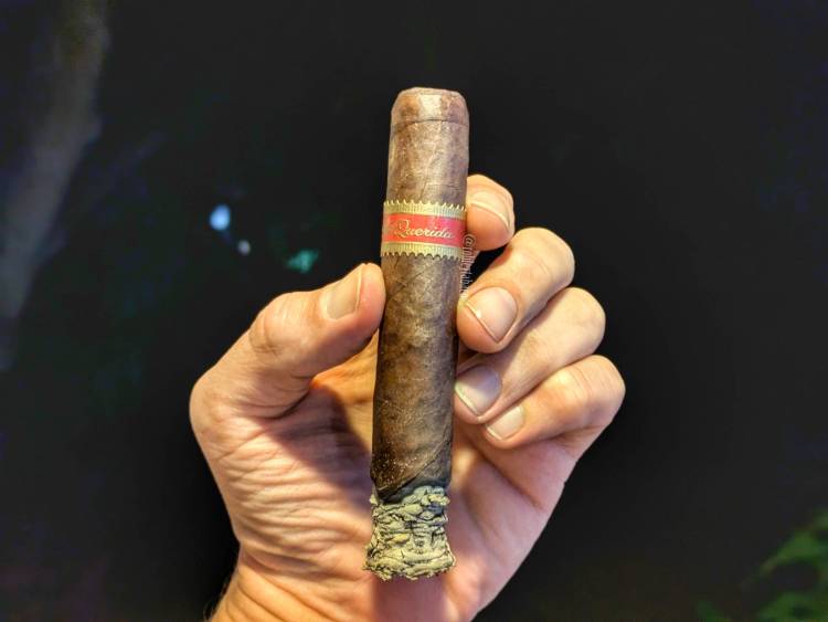 Las palabras de Saka siguen resonando en el segundo tercio y es más o menos al inicio de él cuando le doy algo de razón, no porque no tenga un alto contenido de sensación picante, sino porque efectivamente se siente más denso, como si tuviera más tabaco en la tripa, pero también porque se siente una intensidad dulce casi al mismo nivel de la picante. Hay sabores de pasas, caramelo, chocolate, helado de vainilla y un toque de ralladura de limón, casi parece un cóctel y mi única crítica es que el primer tercio ofreció poco de estos matices cuando tenía una mayor intensidad picante. La quemada sigue siendo buena, aunque no es la mejor ya. La intensidad es alta, con una fortaleza media-alta y una ceniza relativamente escamada.