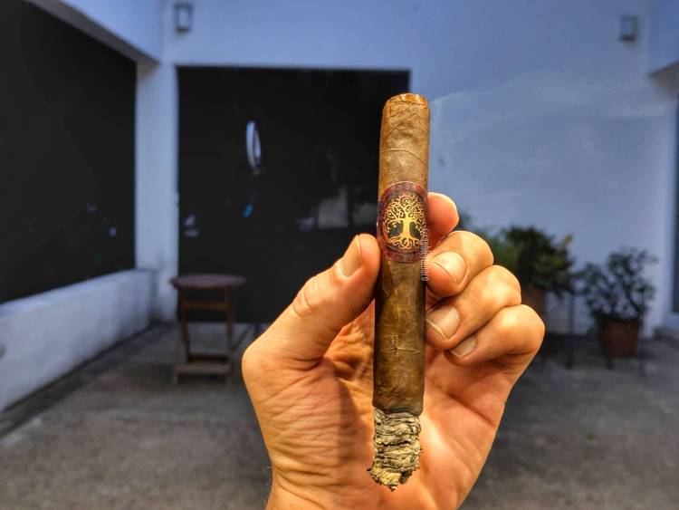 El Axis Mundi comienza con una nota intensa de pimienta que desaparece rápidamente, siendo sustituida por chocolate negro, cereal malteado y una participación algo menor de pimienta que al inicio. A lo largo del tercio aparecen también sabores de melaza y esa nota de cereal se siente más como uno de bolsa, especialmente alguno que contenga chocolate. El tiro está un poquito apretado, pero el humo sigue siendo abundante y la fortaleza se ubica en media-baja, con una intensidad media. La quemada está medio torcida, pero siendo el primer tercio no me pongo demasiado exigente.