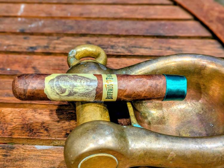 No sé si fue en 2020, pero diría que fue en 2021, cuando Cigars International abrió dos super tiendas en el estado de Florida, decidieron colaborar con la marca de whiskey Buffalo Trace para hacer un cigarro especialmente creado para maridar con el bourbon. Ahora, la relación entre las tiendas de Florida y el whiskey de Kentucky no la conozco, pero fue a partir de ese suceso. El cigarro es hecho por General Cigar en República Dominicana, con una capa Sumatra ecuatoriana sobre un capote Arapiraca brasileño y finalmente tripa dominicana y nicaragüense. El Buffalo Trace está disponible en varias vitolas y el que voy a probar es un robusto con medidas 5 x 49, como para ser bien distinto. Un punto positivo a su favor es que no menciona que haya sido añejado en barricas de bourbon de Buffalo Trace, una tendencia que ya me tiene un poco aburrido.