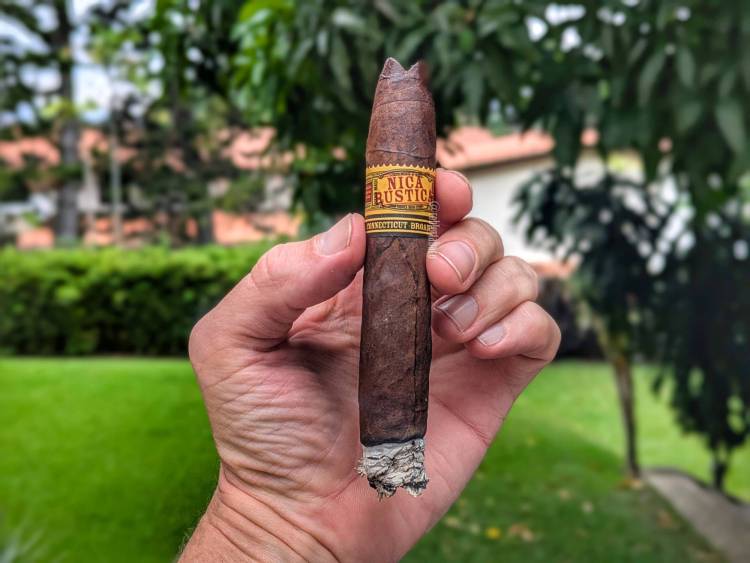 En el último tercio esa nota de tierra húmeda al punto de ser agua sigue intensa, pero también hay una nota adicional de tierra mojada que no estaba seguro si eran ambas la misma o dos distintas. El retrogusto castiga mucho menos y puedo probar por ahí varias veces en este tercio, lo que lleva a la fortaleza a media, aunque la intensidad se mantiene en media también. La nicotina también aumenta y el hecho que lleve dos horas y 20 minutos fumando el Nica Rústica y que ya mis caladas son bastante cortas se traduce en que la nicotina no me pega tanto, pero el aburrimiento sí. Finalmente lo dejo en el cenicero cuando se apagó de un lado y no quise encenderlo de nuevo.