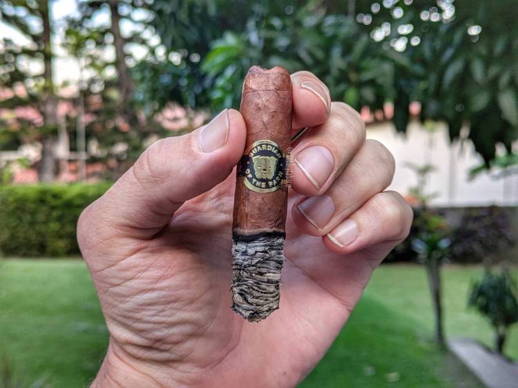 En el último tercio tengo también sabores nuevos de pretzel, más como esa versión que viene enlatada con frutos secos que el pretzel de pan, pero es un sabor bien característico. También pasa que ese sabor de jengibre comienza a tomar matices adicionales, que incluyen una especie de conserva de limón y lo que describiría como hojas de citronela. El café del retrogusto desaparece, siendo únicamente un sabor de pimienta, mientras que en el paladar, además de los sabores nuevos, el resto se mantiene en mayor o menor escala pero con el protagonismo de las galletas danesas seguidas de chocolate. Me toma una hora y 50 minutos fumar el Guardian of the Farm, lo cual fue como media hora más de lo que pensé que me tomaría. Al final la intensidad estaba en media-alta, pero casi en alta, con una fortaleza que se mantuvo en media durante toda la fumada.
