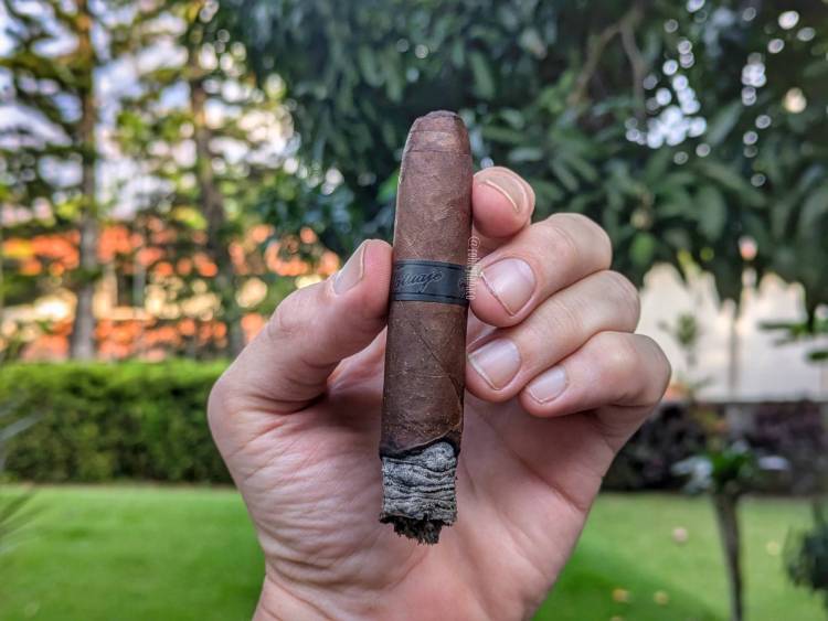 Esa sensación cremosa en donde los sabores se funden y se mantienen largo tiempo en el paladar se mantiene en el segundo tercio y el sabor de chocolate se intensifica, llegando a ser el de mayor protagonismo, pero no es un sabor puro de chocolate o al menos no es el típico de chocolate negro, sino más bien se siente como el chocolate que puedes sentir cuando tomas un chocolate caliente. La pimienta también es abundante, sobre todo en el retrogusto, mientras que los sabores secundarios incluyen leña, canela, granos de café y otros matices de chocolate que recuerdo más como las chispas que tienen algunas donas. La fortaleza se ubica en media-alta, con una intensidad al mismo nivel y una quemada bastante buena.
