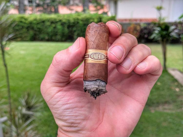 En el último tercio ese sabor de nueces se refuerza, pero el sabor de chocolate se mantiene como principal, mientras que la combinación de sabores de madera se simplifica y solamente se aprecia el de cedro. Hay notas de pimienta, pero ya no se sienten matices de blanca, por lo que es solamente pimienta negra, tanto en paladar como en retrogusto. En este último tercio la fortaleza se ubicó en media, mientras que la intensidad bajó a media también. Me toma una hora y 40 minutos fumar el Buenaventura y el tiro nunca mejoró.