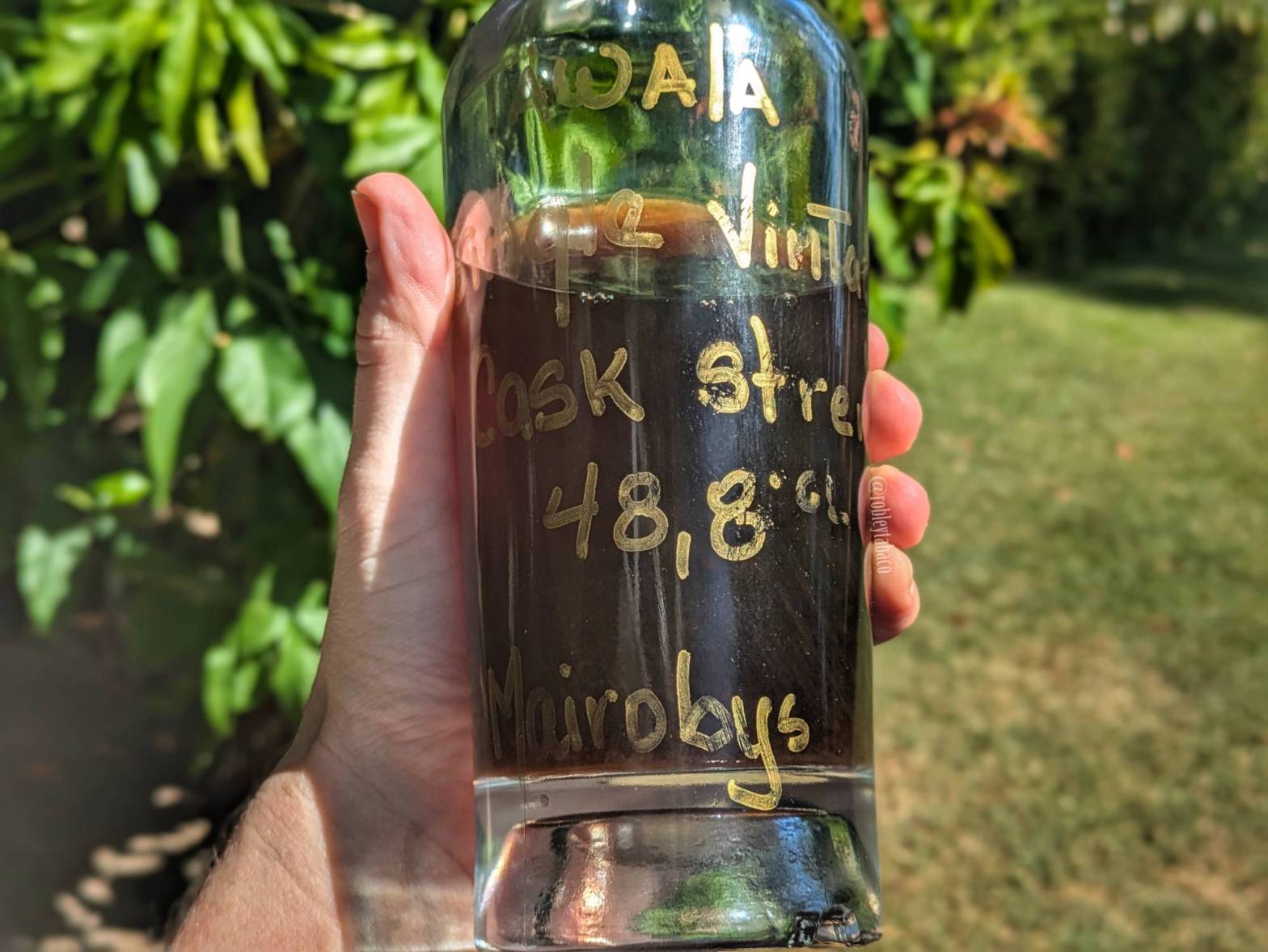 Es sorprendentemente dulce en boca y ese alcohol al 48,8% por supuesto que no pasa desapercibido. Los sabores son básicamente los mismos que en los aromas, aunque hay una sensación ligeramente herbácea que se aprecia principalmente en el sabor del plátano, que casi describiría como hoja de plátano. También hay notas de mazapán y una intensa nota de madera y melaza en el retrogusto.