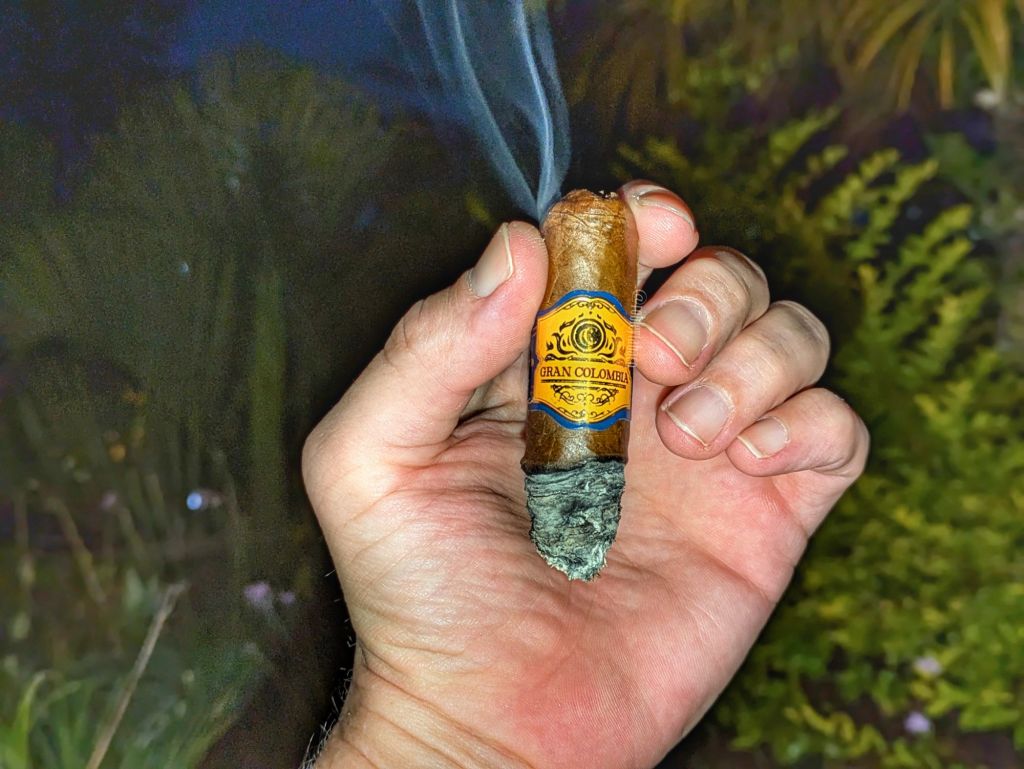 En el último tercio hay un giro interesante, porque puede ser visto como una repetición del primer tercio, o una copia contraria del segundo. Los sabores tienen más pimienta, más chocolate, pero menos madera. Son básicamente los mismos sabores que en el inicio, sobre todo si ves al sabor de paja como parte del sabor de madera y el de nueces como una derivación de la madera también, que en el espectro de sabores pueden estar relacionados, pero no se puede negar que el Gran Colombia Maduro tiene matices y que estos van desplazándose por la experiencia. La intensidad es media, con una fortaleza igualmente media. Cuando cumple una hora y 15 minutos, lo dejo a un lado.