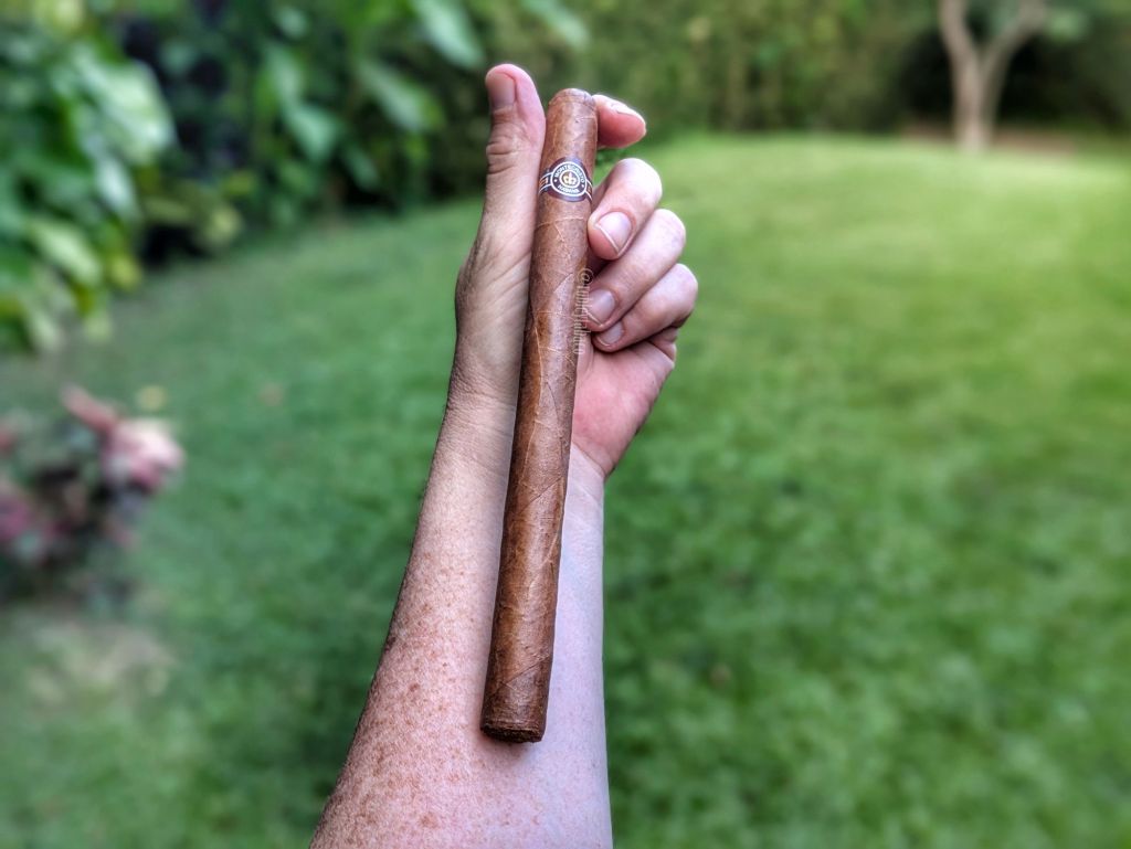 Dado que este Punch tiene menos de 5 pulgadas de largo, divido la reseña en dos mitades y no en tres tercios. Además, el cigarro se siente muy liviano en mis manos, casi como si fuera una muestra, pero investigo un poco y su poco peso es característico. La capa tiene lo que parece ser una pequeña corrección sobre ella, como si se hubiera roto un poco y le pusieron un remache de tabaco. Pero tiene aromas agradables a cuero y fermento, mientras que en el pie encuentro aromas a azúcar refinada y nuez moscada. Lo pico con la doble hojilla y la calada en frío me demuestra que tiene un tiro muy cubano y aromas a notas cítricas de cáscara de limón y una nota suave de madera.
