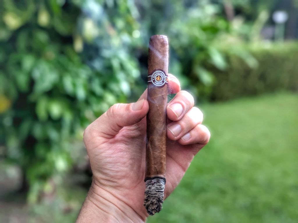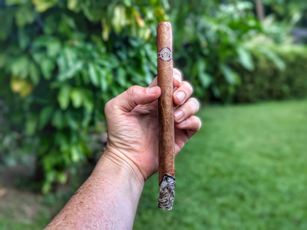 Hace un par de años, cuando hice mi curso de Habanos Sr., quien dictaba el curso decía que incluso con un tiro apretado hay que disfrutar del habano, porque hay que celebrar a quien lo haya construido y la manera tan artesanal de hacerlo. Es solo por eso que me mantengo con el cigarro, pues de verdad que el tiro es apretado y por tanto, el humo nunca es denso. Pero los sabores están ahí e incluyen madera de cedro, notas florales, leña y en el retrogusto hay notas sutiles de vainilla y pimienta negra. La fortaleza es baja, con una intensidad media, que espero vaya aumentando. Quema bien, o al menos recto para tener un tiro tan apretado. A lo largo de esta primera mitad también encuentro sabores de tierra seca y esa cáscara de limón agarra un matiz de naranja también.