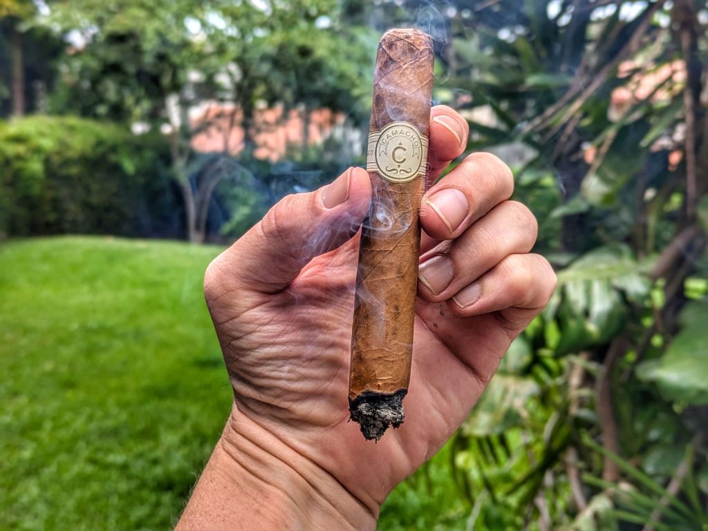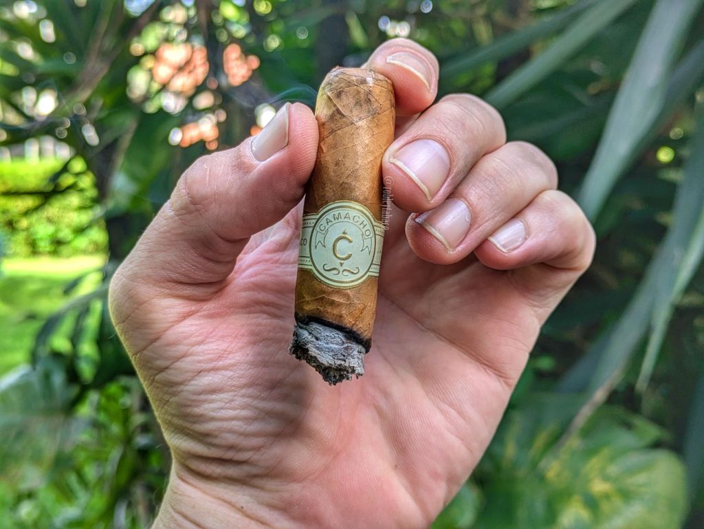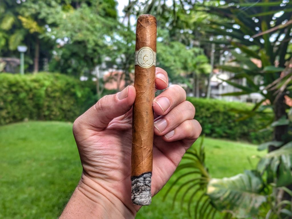 Desde las primeras caladas es fiel a esa misma idea de sutileza en sus sabores. Se podría decir que no es complejo y sería verdad, pero no por ello es un cigarro que no guste. De hecho, las primeras caladas tienen sabores a madera y paja, con algunas notas cítricas de cáscara de limón y una nota muy herbácea hacia la mitad del cigarro. Como he mencionado anteriormente, los cigarros con cañón menor a 5 pulgadas los divido en dos mitades y no tres tercios como el resto de las fumadas. El retrogusto tiene un toque de picante, pero no de pimienta, pero sí quema muy bien y tiene un anillo de combustión considerablemente recto. La ceniza destaca algunas «pecas» blancas que hablan mucho de los minerales y específicamente el magnesio en el suelo de la cosecha. La fortaleza es baja, con una intensidad media-baja.