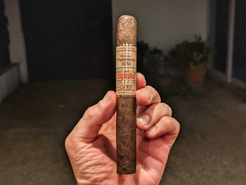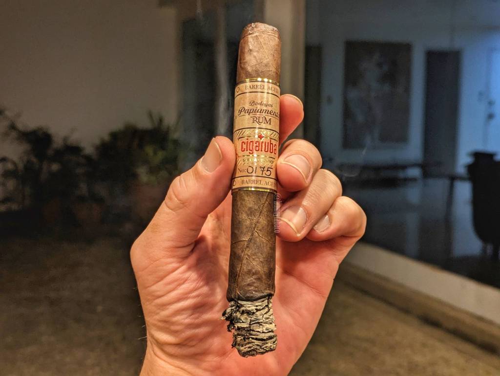 Este cigarro tiene fácilmente unos 8 años en el humidor, aunque pueden ser hasta 10. Por ello, los aromas en la capa no son tan abundantes como quizá lo eran originalmente y apenas si percibo chocolate y algo como cuero seco. Estos aromas se repiten en la calada en frío, así como en la tripa, en distintas intensidades, pero sin llamar mucho la atención. La capa es uniforme de color y muy bien situada, y el tiro en frío, bastante fluido. Lo piqué con la guillotina en V, porque desde que descubrí ese corte para figurados, es el preferido.