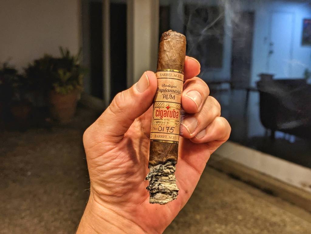 La tendencia diagonal de la quemada se corrige sola en el segundo tercio, incluso mucho antes de hacer la foto. Los sabores no cambian drásticamente, pero sí se siente una gran reducción en el sabor de café, mientras que el de chocolate adquiere una propiedad que me recuerda más a una galleta de chocolate chip que un chocolate solo. El retrogusto sigue siendo dominado por el sabor de caramelo, esta vez sin sal y sin sensaciones picantes. Esos son todos los sabores que aprecio, aunque la intensidad aumenta a media, con una fortaleza media también.