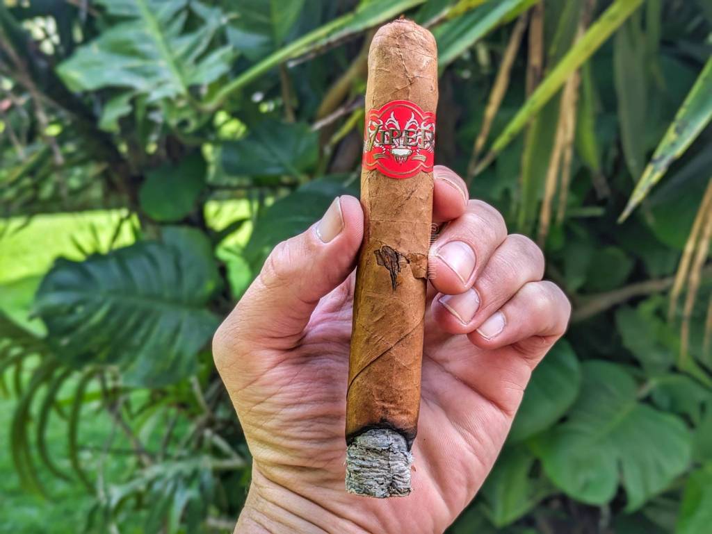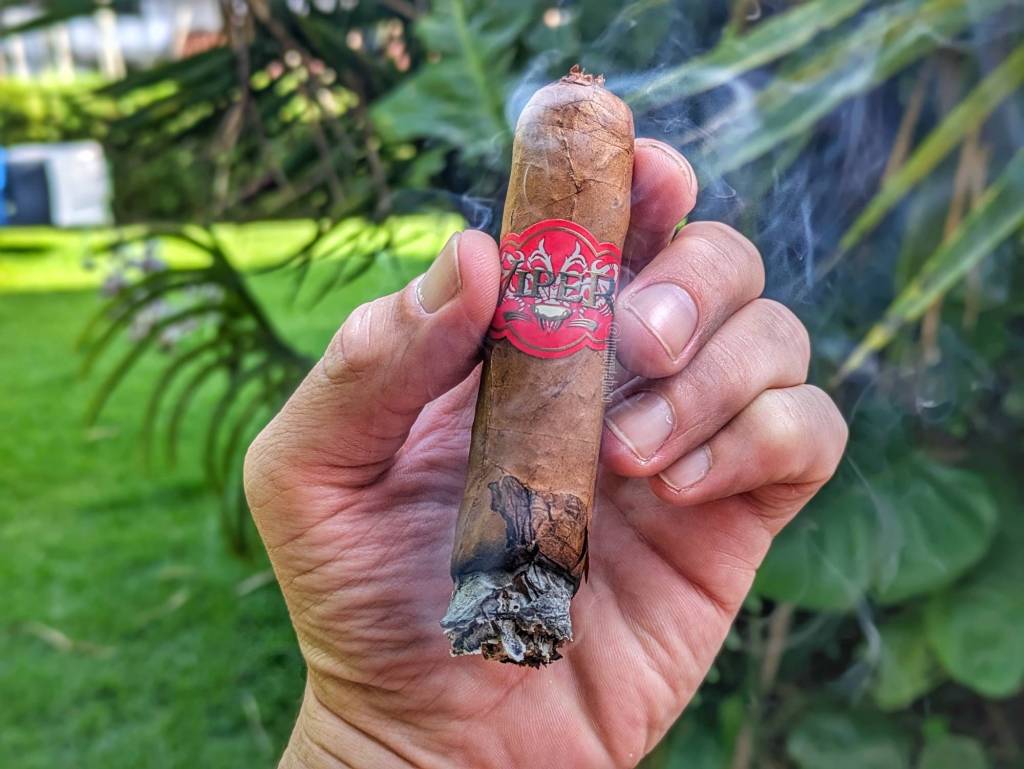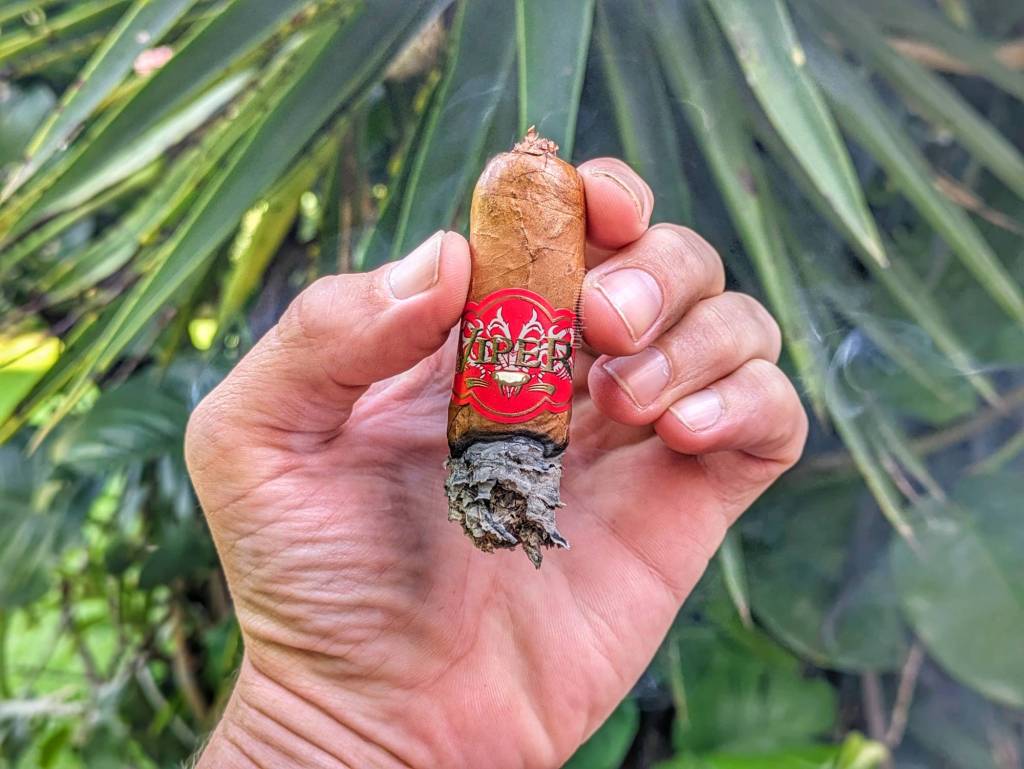 En el último tercio, el Viper siguió quemando torcido, aunque ya había superado el problema y no sé si son secuelas debido a haber pasado tanto tiempo con la capa accidentada. Sin embargo, un amigo que hace tabacos me enseñó hace tiempo que cuando ves un borde negro de cierto grosor en el anillo de combustión de un cigarro, eso indica una hoja mal fermentada o que no se le dio suficiente fermentación. Los sabores siguen la misma tendencia minimalista del tercio anterior, salvo que el sabor de madera se siente como de un lápiz, con notas de grafito incluidas. La quemada se mantiene irregular en su forma, pero no se llega a apagar, aunque hay un punto antes de llegar al final que me doy cuenta que el Viper no va a mejorar ni aportar más nada. En ese momento lo dejo en el cenicero, aunque ya ha pasado una hora y 15 minutos desde que lo encendí.