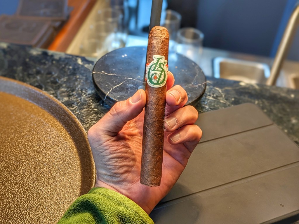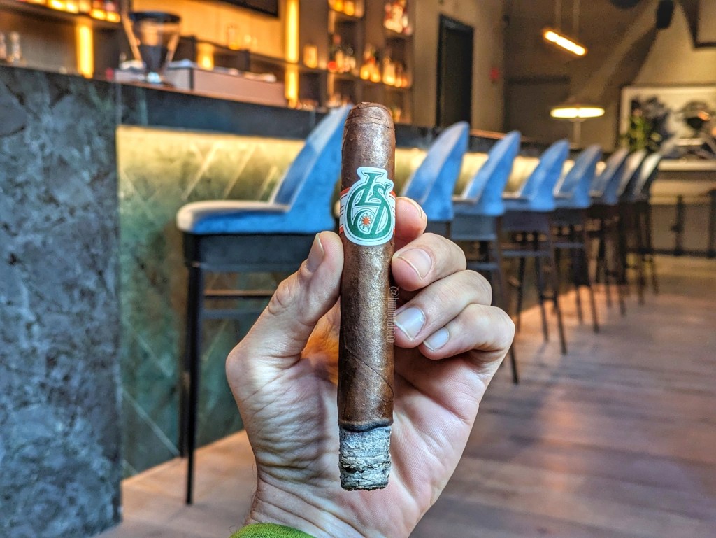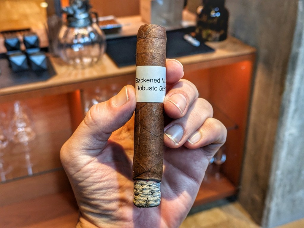 El cigarro que tengo conmigo pertenece a un batch de pre-lanzamiento realizado por la marca y que estuvo disponible en un evento que llama Barnsmoker, y fue un obsequio de un amigo que está muy metido en el tema de la marca. El nombre del cigarro, al igual que el del whiskey, Blackened, es el nombre de una canción de Metallica que aparece en su disco …And Justice For All, de 1988. En el caso del whiskey, hace juego con el hecho que las barricas en donde es añejado son bastante quemadas y oscuras, pues la palabra quiere decir «ennegrecido». En el caso del tabaco hace juego con que la capa es muy oscura. En efecto, es considerablemente oscura y se trata de un cigarro que, aunque es un robusto 5 x 50, se siente denso y pesado. Tiene aromas a frutas oscuras, tipo ciruela, también chocolate y toques de madera y pimienta negra, mientras que la calada en frío aporta aromas de chocolate dulce y notas saladas.