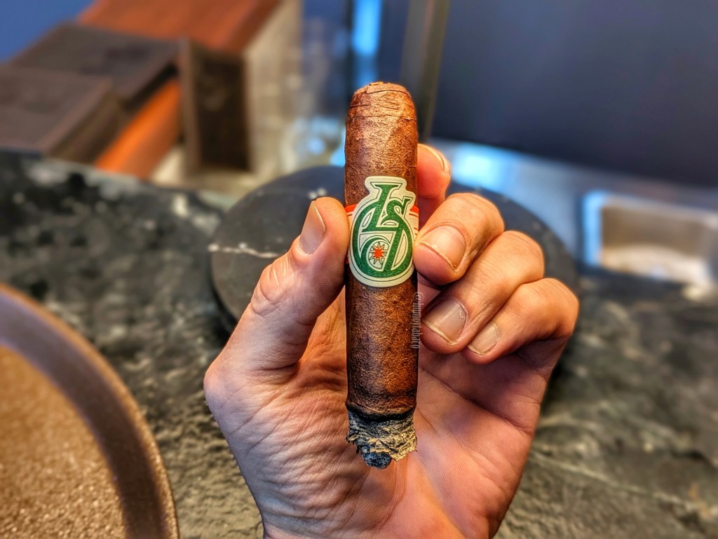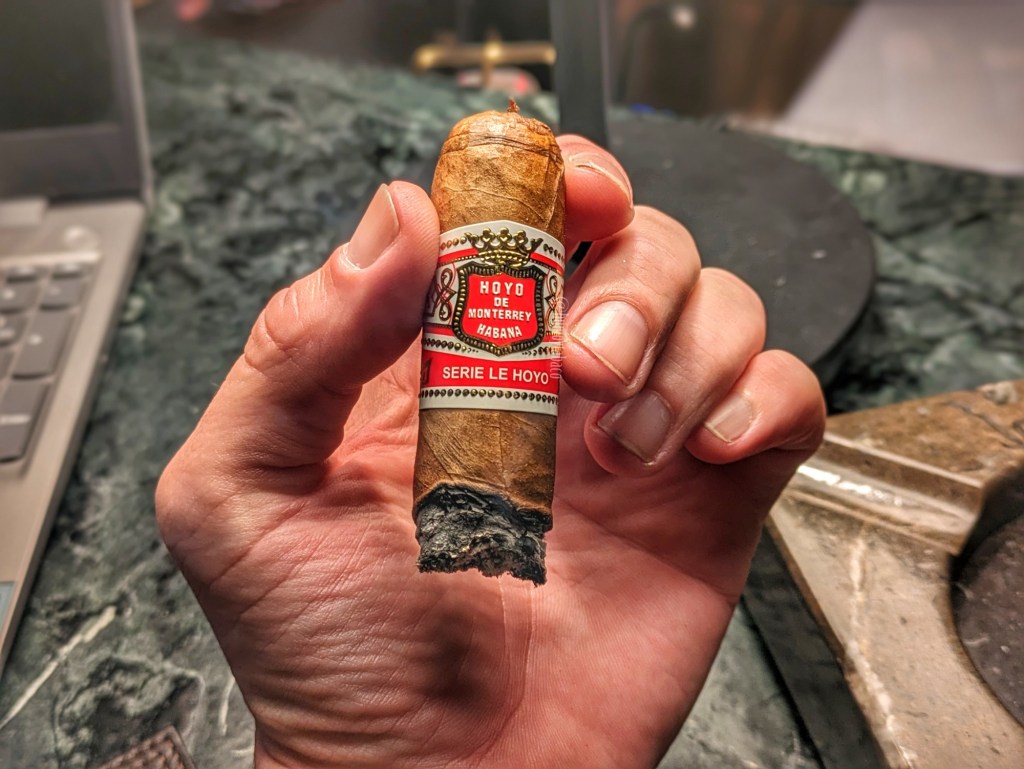 No hay cambios en el último tercio, salvo que en términos generales la primera mitad fue muchísimo más fuerte que la segunda; no quiero decir que la segunda mitad haya sido suave, pero en comparación con la primera, al menos en ella encontré la intención de fumar este cigarro hasta el final. Me tomó una hora y 20 minutos llegarlo hasta el último punto de fumada y una vez ahí descubrí que lo hubiese podido haber dejado a un lado comenzando el último tramo y mi impresión sería la misma. Los sabores en este tercio se sienten más, pero no dejan de ser sutiles, quizá porque la pimienta los domina. En términos generales es como buscar sabores distintos en una piscina de pimienta.