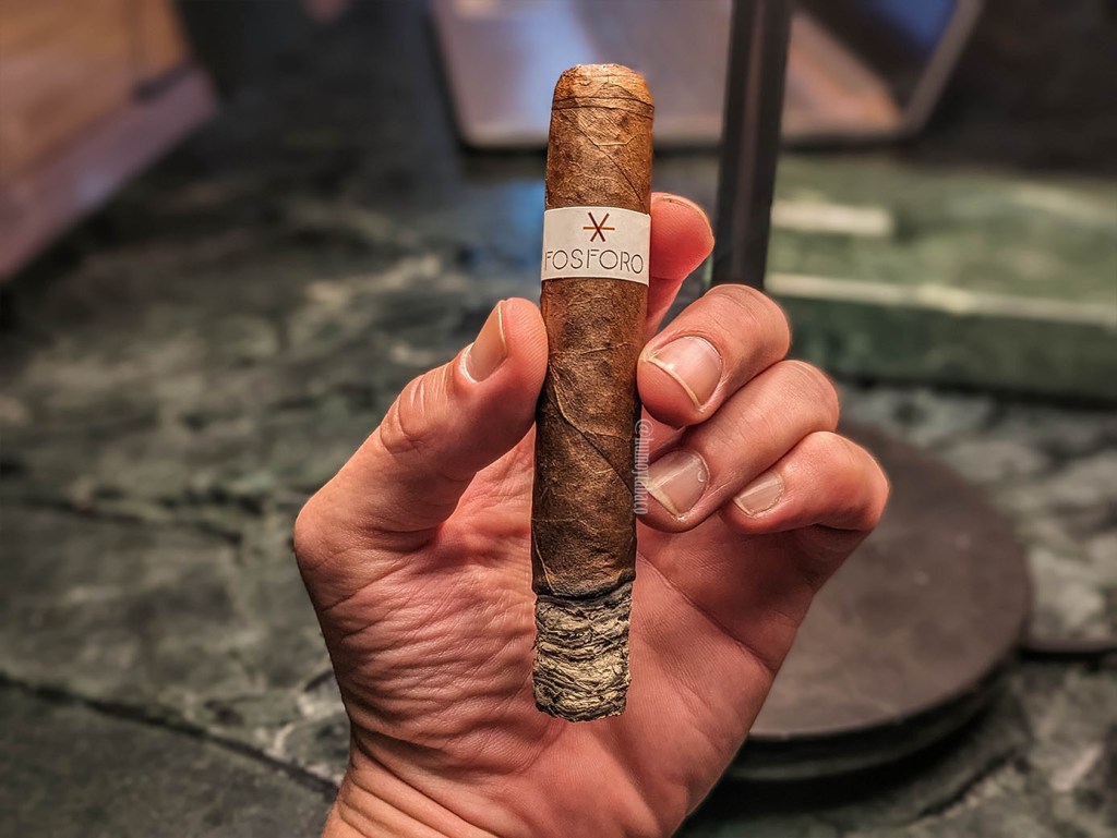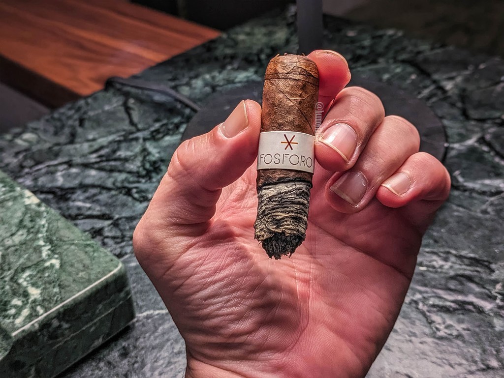 En el último tercio hay pocos cambios, pero todos son significativos. Para empezar, los distintos matices de madera parecen concentrarse principalmente en el sabor de roble, que en el primero y segundo tercio eran más como el más lejano de los matices de madera, por lo que esa evolución se ha hecho muy interesante y en este último tramo ha presentado una mayor intensidad del que menos sentía. Además, la sensación picante se ha traducido en una sensación más seca en la garganta y aunque esto no ha significado mucho en términos de sabores, sí he espaciado un poco más cada calada. Esto nos lleva al tercer punto de este último tercio y es que el cigarro se ha apagado un par de veces, en parte porque el espaciar las caladas hace que pase más tiempo en «neutro» el cigarro pero el tema del tiro se ha apretado en este final, sin duda por el cepo y la interacción de la saliva y el calor. Le hice un pequeño corte adicional, pero este no ayudó y es una atención constante al encendido lo que lo mantiene andando en la sección final. No obstante, me toma una hora fumarlo hasta el punto que ya me quemo los dedos.