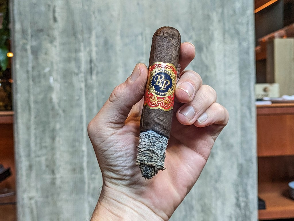 Las notas de pimienta y madera son prevalentes en el primer tercio, con una marcada potencia, principalmente en el retrogusto y no me sorprende que incluya sabores de manzana, aunque estos se sienten más que nada en el paladar. Aproximadamente para el momento de la imagen también hay sabores de toffee ahumado y la apreciación de sabores en el retrogusto se reduce un poco. Pero estoy tan concentrado en los sabores y el retrogusto, que no me doy cuenta que la ceniza se sostiene muy bien sobre el cigarro y aunque el anillo de combustión está algo torcido, me cuesta dejar caer la ceniza. Hacia el final del tercio los sabores de manzana también aparecen en el retrogusto, seguramente gracias a que la sensación picante en la nariz se ha reducido. La intensidad es media, con una fortaleza media-baja en esta sección.