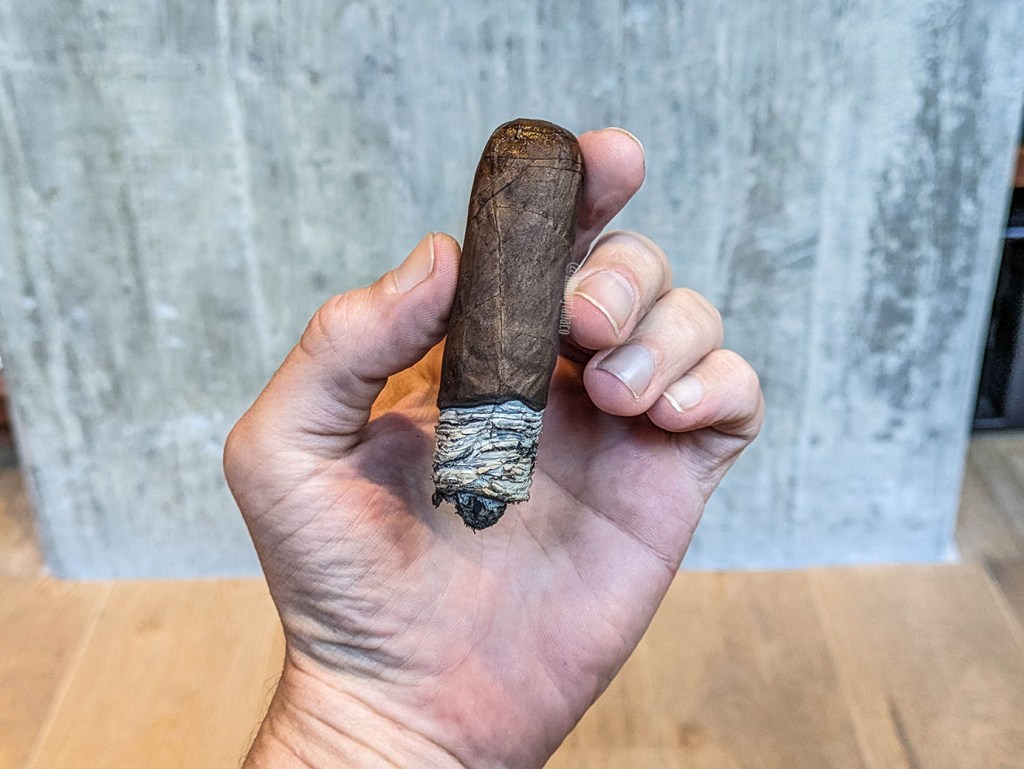 Los sabores en el último tercio no son los más agradables, sobre todo por los problemas de quemada, que me han llevado a reencenderlo más de 4 veces. Son abundantes de pimienta o de sensación picante, mejor dicho, y hay pocas instancias de sabores adicionales, aunque logro un equilibrio entre darle caladas regulares y que se mantenga encendido que me permite apreciar notas adicionales a tierra y ahumado. Al cabo de una hora y 40 minutos, el Anastasia Yellow Label finalmente se termina, aunque creo que me hubiese durado un tanto menos si la llama se mantuviera siempre. Pero también me habría gustado más. La intensidad y fortaleza se reducen en el último tercio, o al menos es lo que siento en comparación con ese golpe de sensación picante después de reencenderlo, que sin duda no puedo asignar a la fumada.