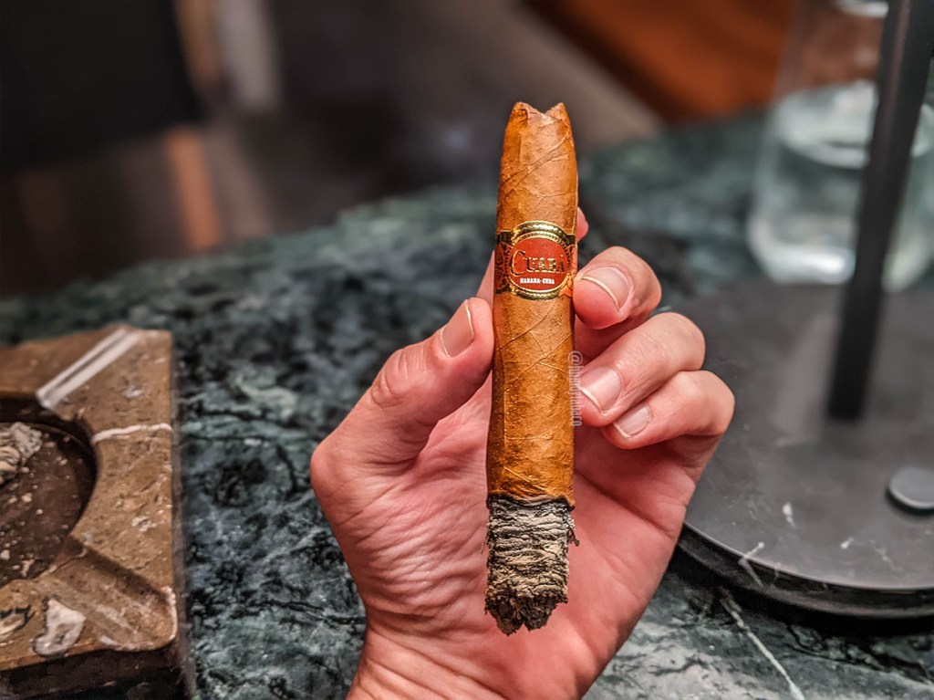 El Cuaba Salomón enciende rápidamente y gracias a que es prácticamente un punto el que se debe encender, es fácil hacerlo mal. Afortunadamente tengo un encendedor de una sola llama que lo hace más sencillo y menos propenso a errores. Hay algunas cosas que me hacen sospechar sobre la calidad de la fumada y es que en cigarros de estos estilos, las primeras caladas tienden a ser apretadas y luego se van abriendo, pero el Salomón tiene un buen tiro desde la primera calada, con humo abundante para ser un habano. Pero, para mi sorpresa, el tiro no se suelta tanto como sospechaba al llegar a una quemada más general, por lo que está básicamente en donde me gusta y con excepción del anillo de combustión, va quemando bastante bien. Los sabores son impresionantes, con notas de pimienta y una especie de caramelo, ese que llaman golden syrup. También hay notas secundarias de nueces, tierra y cedro, siendo este último el que repite en el retrogusto y es ahí donde no se sienten tantas notas de pimienta como suelen haber en cigarros de otros orígenes, en donde un toque de pimienta en el paladar se traduce en algo mucho más fuerte en el retrogusto. La intensidad es media, con una fortaleza un toque por debajo de media.