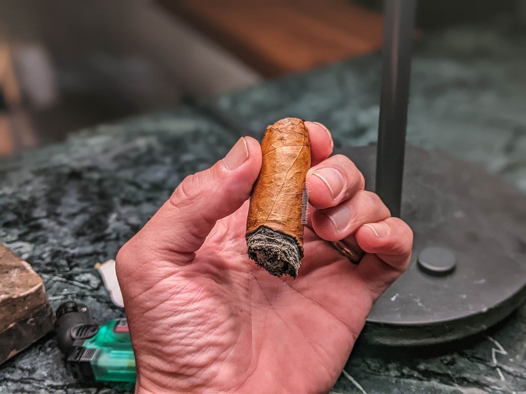 El Salomón en su último tercio demuestra una consistencia impresionante, con los mismos sabores en más o menos el mismo orden, pero la apariencia de notas más picantes y no necesariamente un sabor a pimienta. Quizá se trate por la concentración del tamaño del cigarro y que este esté en sus últimos momentos, y desde la mitad del último tercio se hace más dulce, partiendo de ese mismo sabor de caramelo. La intensidad es idéntica a la del tercio anterior, pero la fortaleza aumenta un tanto y se coloca en media. Me toma un poco más de dos horas llegar al final del Salomón y no es para menos, pues me lo fumé hasta que me quemé los dedos.