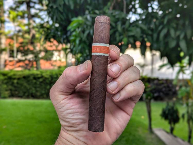 La vitola belicoso en la que lo voy a disfrutar tiene medidas de 5½ x 52 y considerando mi experiencia con el Super Ligero, me lo voy a tomar con suavidad esta vez. Sin embargo, de esos Super Ligero terminé comprando varios porque me gustaba bastante. Por lo pronto, en verdad no sé cuánto tiempo tiene este cigarro, pero sé que no lo fabrican desde hace varios años. Pero su capa es bastante oscura y con un ligero box press, y aromas a chocolate y nueces tostadas, mientras que en el pie se siente tierra y una sensación picante, mas no una nota de pimienta. Lo pico con la guillotina en V y la calada en frío me da aromas de cuero, chocolate y maní.